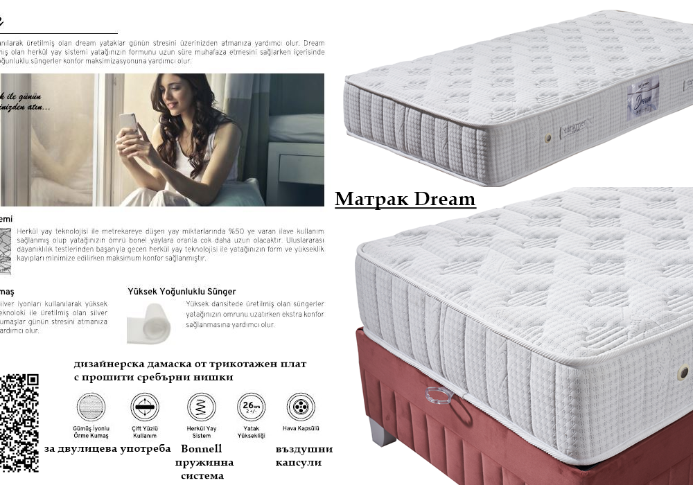 Матрак Dream е с ядро от Bonel / Бонел DCS динамична пружинна система. Добавени са омекотяващи слоеве от висококачествен дунапрен с висока плътност, омекотителна вата и силиконизирани влакна. Матрак с балансираща система, която защитава извивките на гръбначния стълб, като поддържа кръста, гърба, главата, врата и областта на коленете. Матрак Dream е снабден с дизайнерска дамаска с прошити сребърни нишки, от качествен трикотажен плат, предотвратява изпотяването благодарение на въздушните капсули / канали по цялата повърхност.