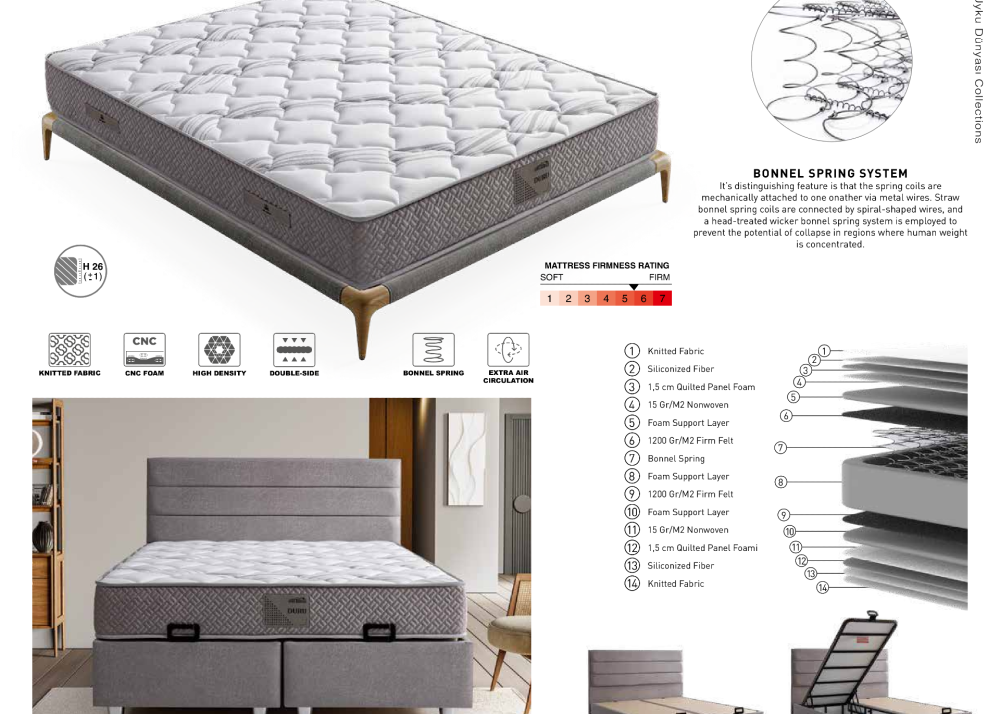- Матрак Duru е с ядро от Bonel Spring пружинна система и допълнителни омекотяващи слоеве от дунапрен с висока плътност и HR пяна.