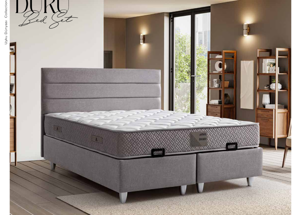 Тапицираното спално легло Duru от стилната колекция Uyku Dünyasi съчетава модерен дизайн, безкомпромисно качество и практична функционалност – перфектен избор за елегантно и уютно обзавеждане.