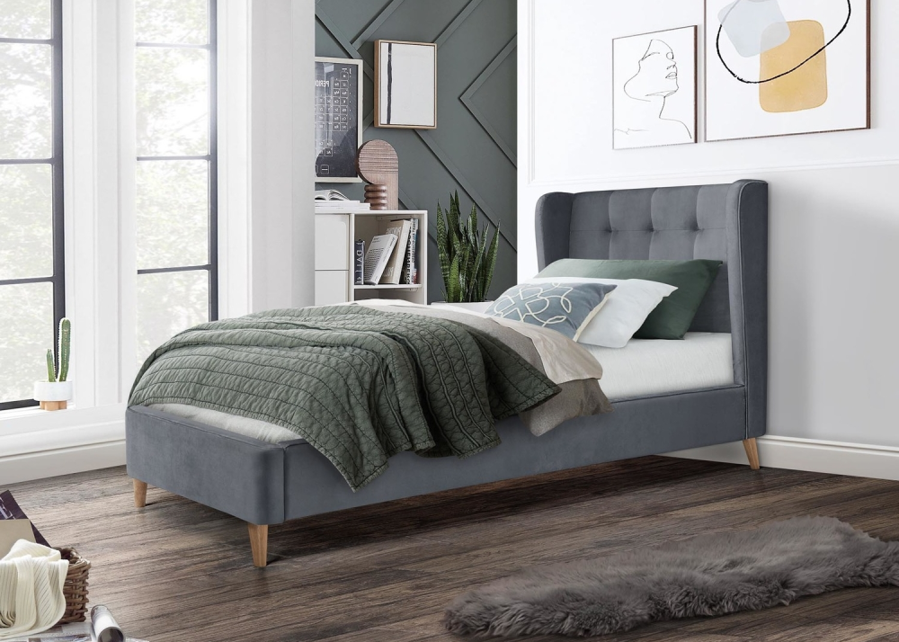 Тапицирано легло Estella 90 в Сив цвят, комплект с подматрачна рамка. Капитонирано е с кадифена дамаска, в модерен дизайн. Тапицирано легло Estella се предлага в 2 размера и 3 цвята.