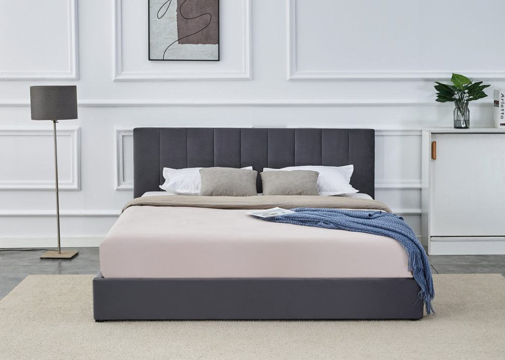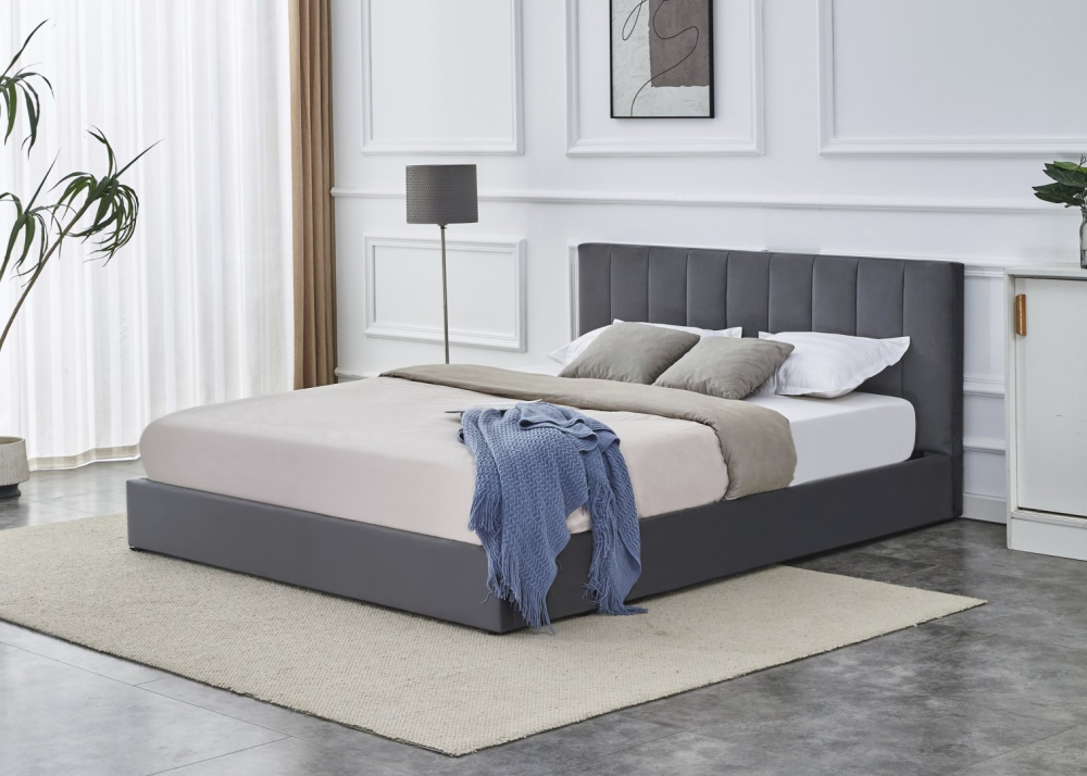 Тапицираното легло Katarina в сив цвят впечатлява с елегантна капитонирана табла и основа, облечени с висококачествен кадифен плат BLUVEL. Моделът е оборудван с повдигаща се метална подматрачна рамка с газови амортисьори, която разкрива удобно подматрачно пространство за съхранение. Предлага се в размер за матрак 160/200 см и е отличен избор за всяка модерна спалня. Комбинира стил, комфорт и практичност – перфектно решение за цялостно спално обзавеждане.