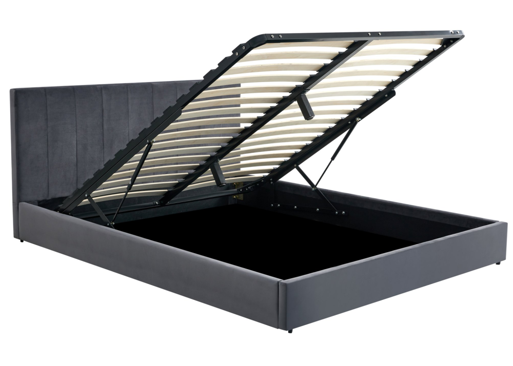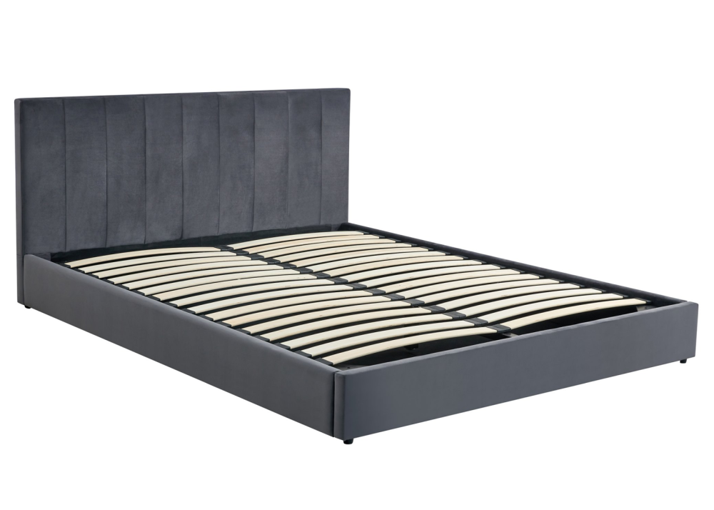 Моделът е окомплектован готов вариант, включващ здравa MDF основа и масивна дървесна конструкция с ламинирано дъно, повдигаща се метална подматрачна рамка с дървени ламели и газови амортисьори. Благодарение на просторно подматрачно отделение, леглото осигурява практично място за съхранение на спално бельо, завивки и вещи, съчетавайки функционалност и модерен дизайн.