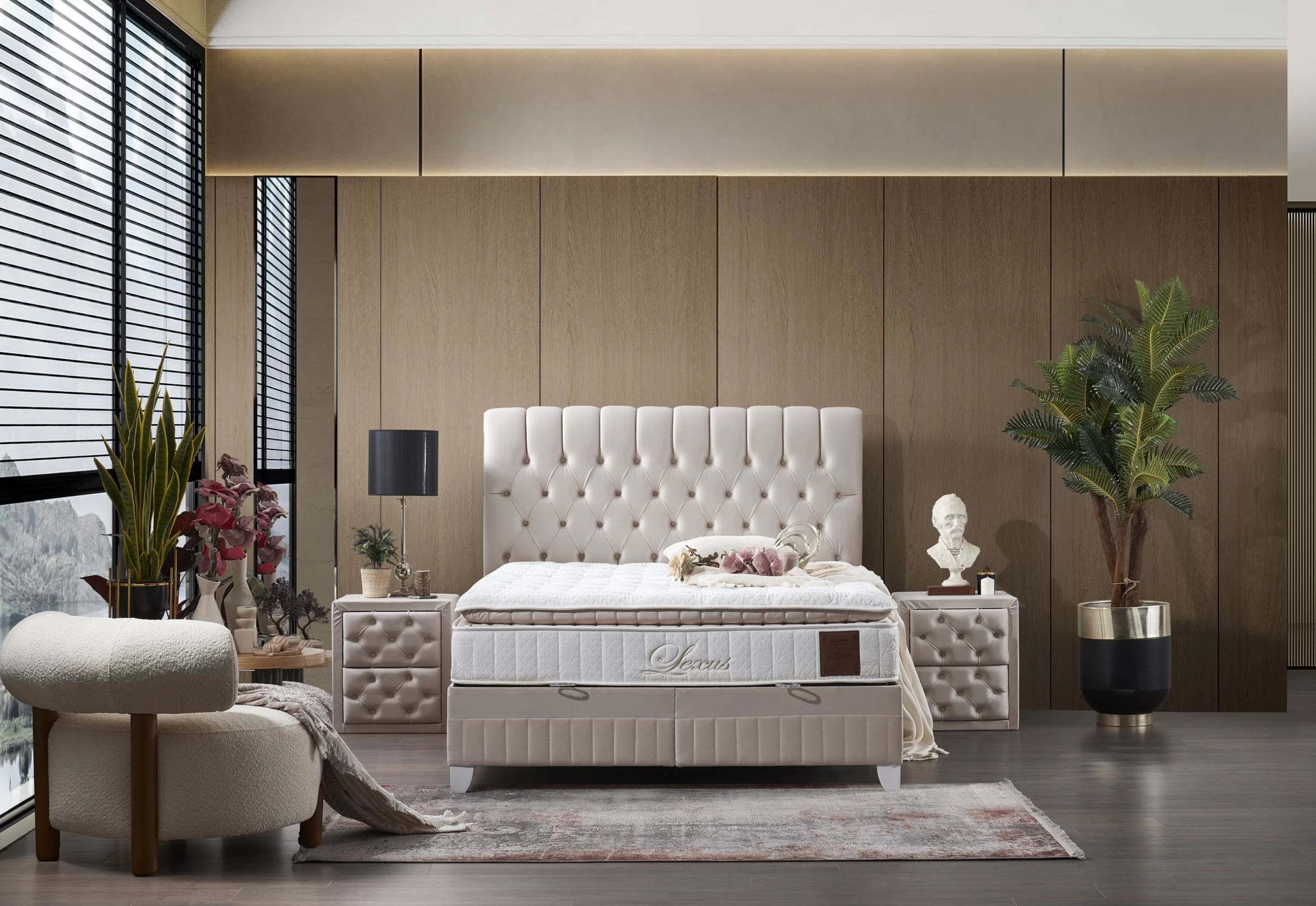 Тапицирано легло Lexus е отличаващ се модерен дизайн, капитонирано с качествена дамаска в цвят Бял Крем. Състои се от луксозна капитонирана табла, капитонирана основа и повдигаща се подматрачна рамка.
