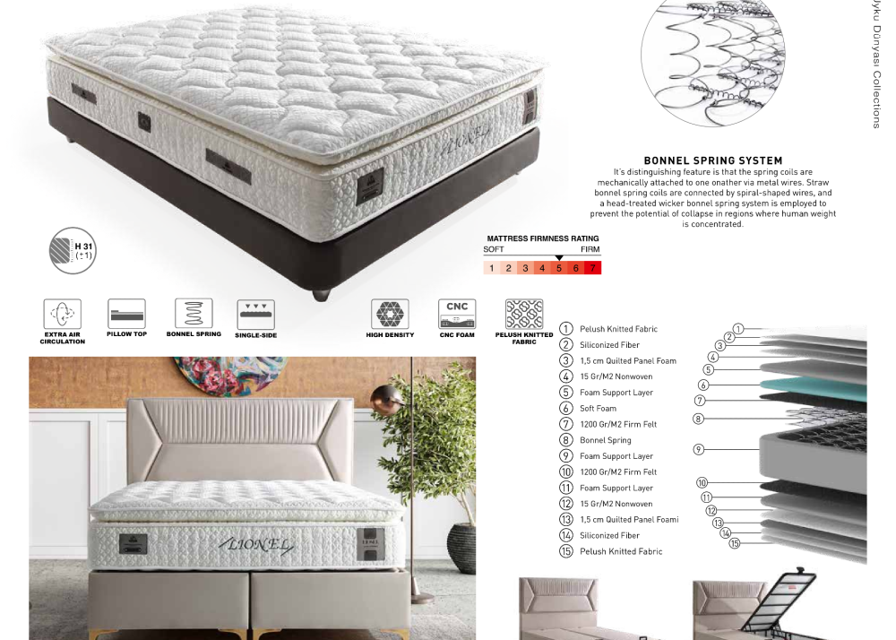 - Матрак Lionel е с ядро от Bonel Spring пружинна система обвита с борд от дунапрен с висока плътност и допълнителни омекотяващи слоеве от дунапрен, мека пяна, твърда пяна.