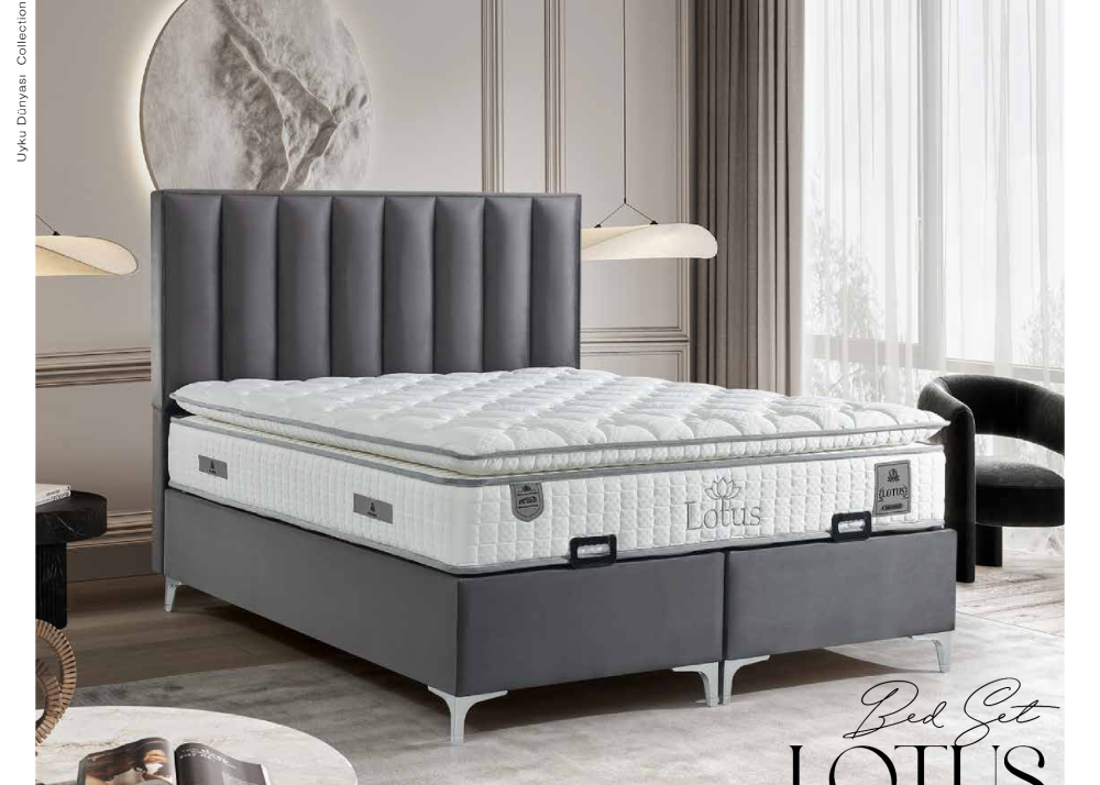 Тапицирано легло Lotus от колекцията Uyku Dünyasi в сив цвят е изработено с внимание към детайла – тапицерия с качествена дамаска VENUS SOFT GREY създава уют и модерна визия. Модел Lotus може да се закупи без матрак или в комплект с матрак Lotus който притежава прошит топ матрак за допълнителна мекота и стабилна опора. Тапицирано спално легло Lotus разполага с капитонирана табла и основа, както и с повдигаща се подматрачна рамка с газови амортисьори, предоставяща просторно място за съхранение на завивки, спално бельо и други вещи.