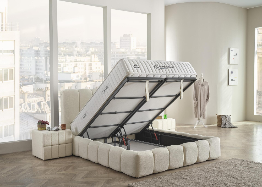 Тапицирано легло Marshmallow е модулен, напълно окомплектован модел, който се състои от капитонирана табла и капитонирана основа с вградена повдигаща подматрачна система.