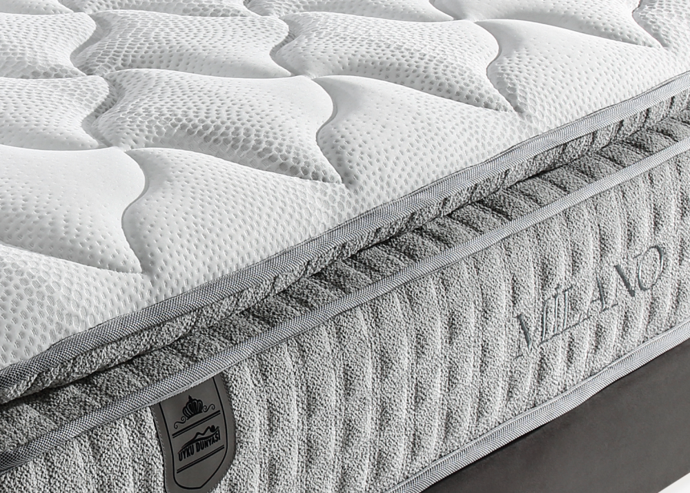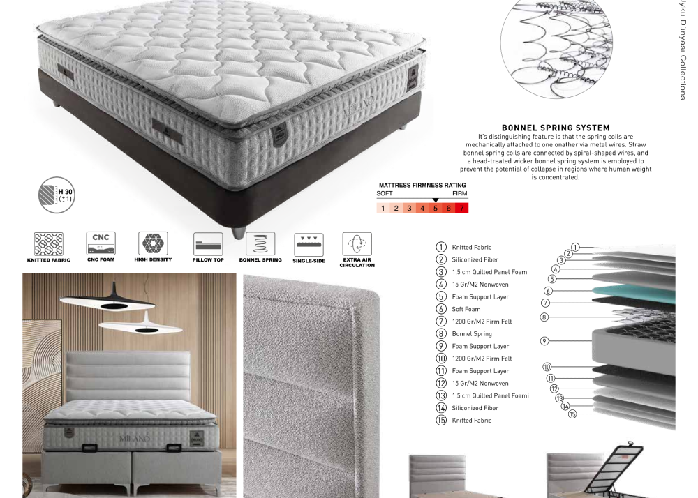 - Матракът Milano разполага с прошит топ матрак от едната страна и ядро с Bonnell Spring пружинна система, обвито с борд от дунапрен с висока плътност за допълнителна устойчивост. Вътрешността е допълнена с омекотяващи слоеве от дунапрен, мека и твърда пяна, които осигуряват стабилност и дълготраен комфорт по време на сън. Финалният акцент е дишащата дизайнерска дамаска Knitted Fabric, която съчетава естетика и проветривост.