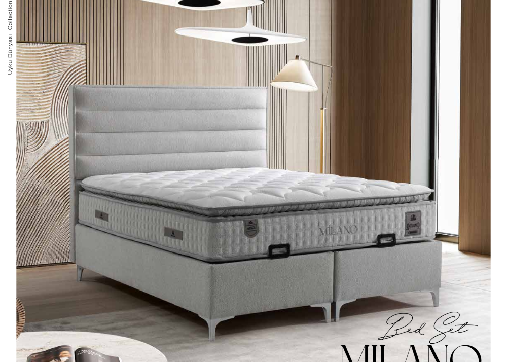 Тапицирано легло Milano от колекцията Uyku Dünyasi в цвят Сив алуминий е изработено с внимание към детайла – тапицерия от висококачествена дамаска LONDON 030 SILVER създава уют и модерна визия. Легло Milano може да се закупи без матрак или в комплект с матрак Milano който притежава прошит топ матрак за допълнителна мекота и стабилна опора. Тапицирано спално легло Milano разполага с капитонирана табла и основа, както и с повдигаща се подматрачна рамка с газови амортисьори, предоставяща просторно място за съхранение на завивки, спално бельо и други вещи.