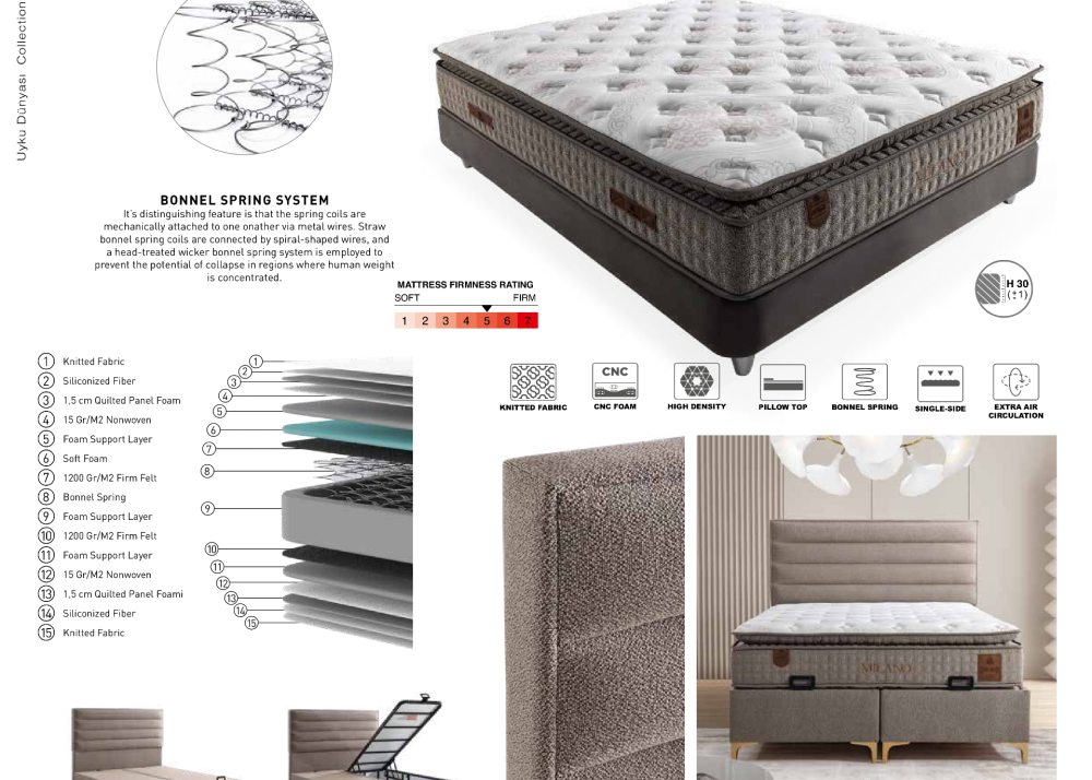 - Матракът Milano разполага с прошит топ матрак от едната страна и ядро с Bonnell Spring пружинна система, обвито с борд от дунапрен с висока плътност за допълнителна устойчивост. Вътрешността е допълнена с омекотяващи слоеве от дунапрен, мека и твърда пяна, които осигуряват стабилност и дълготраен комфорт по време на сън. Финалният акцент е дишащата дизайнерска дамаска Pelush Knitted Fabric, която съчетава естетика и проветривост.