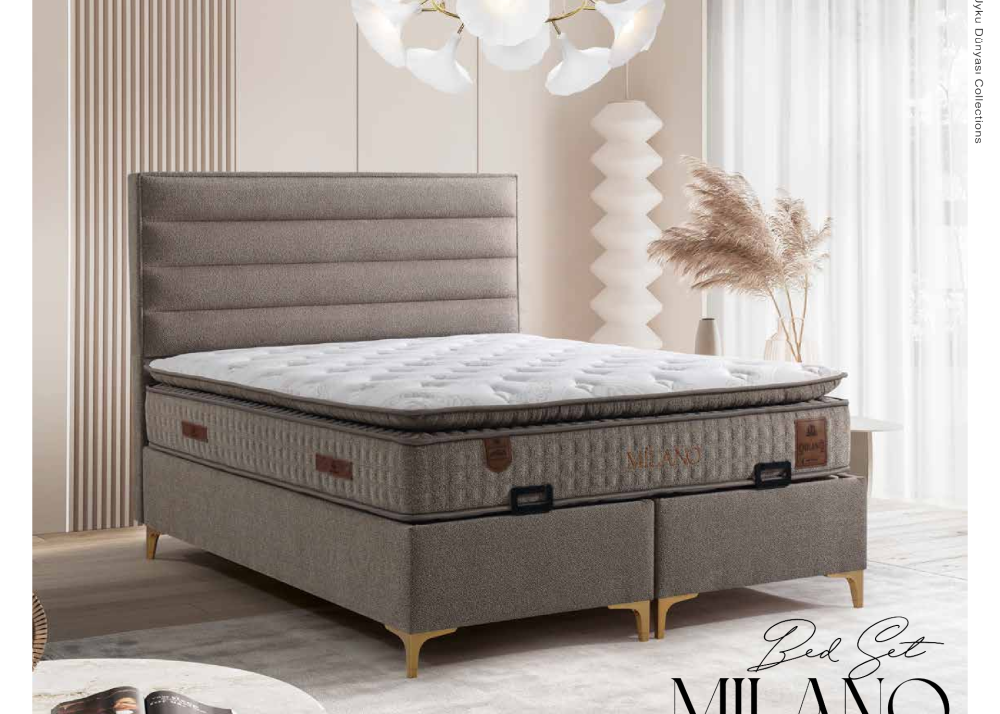 Тапицирано легло Milano от колекцията Uyku Dünyasi в светлокафяв цвят е изработено с внимание към детайла – тапицерия от висококачествена дамаска LONDON 340 BROWN създава уют и модерна визия. Легло Milano може да се закупи без матрак или в комплект с матрак Milano който притежава прошит топ матрак за допълнителна мекота и стабилна опора. Тапицирано спално легло Milano разполага с капитонирана табла и основа, както и с повдигаща се подматрачна рамка с газови амортисьори, предоставяща просторно място за съхранение на завивки, спално бельо и други вещи.
