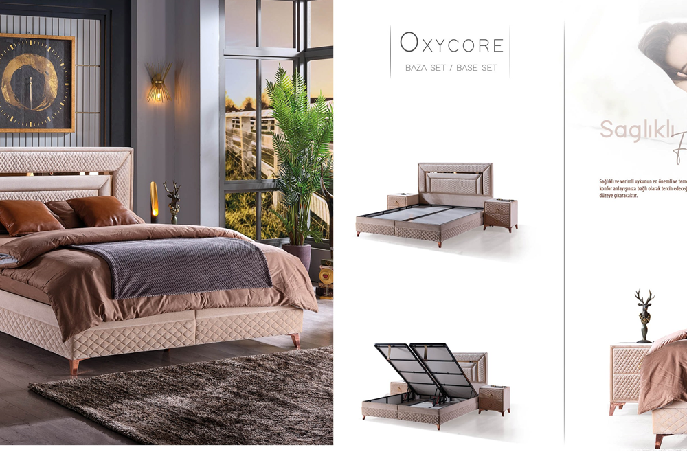 Тапицирано легло Oxycore е модулно, готов окомплектован вариант, който се състои от капитонирана табла и капитонирана основа с повдигаща подматрачна рамка. По желание може да се закупи в комплект с луксозен матрак Oxycore или без матрак.