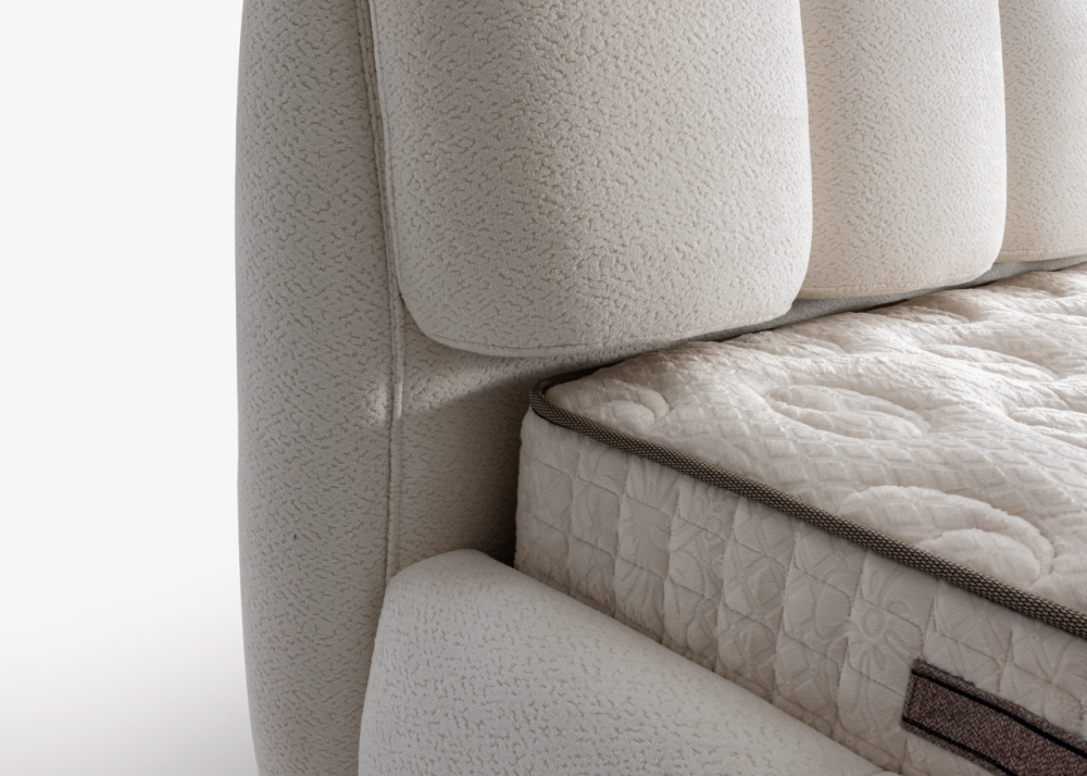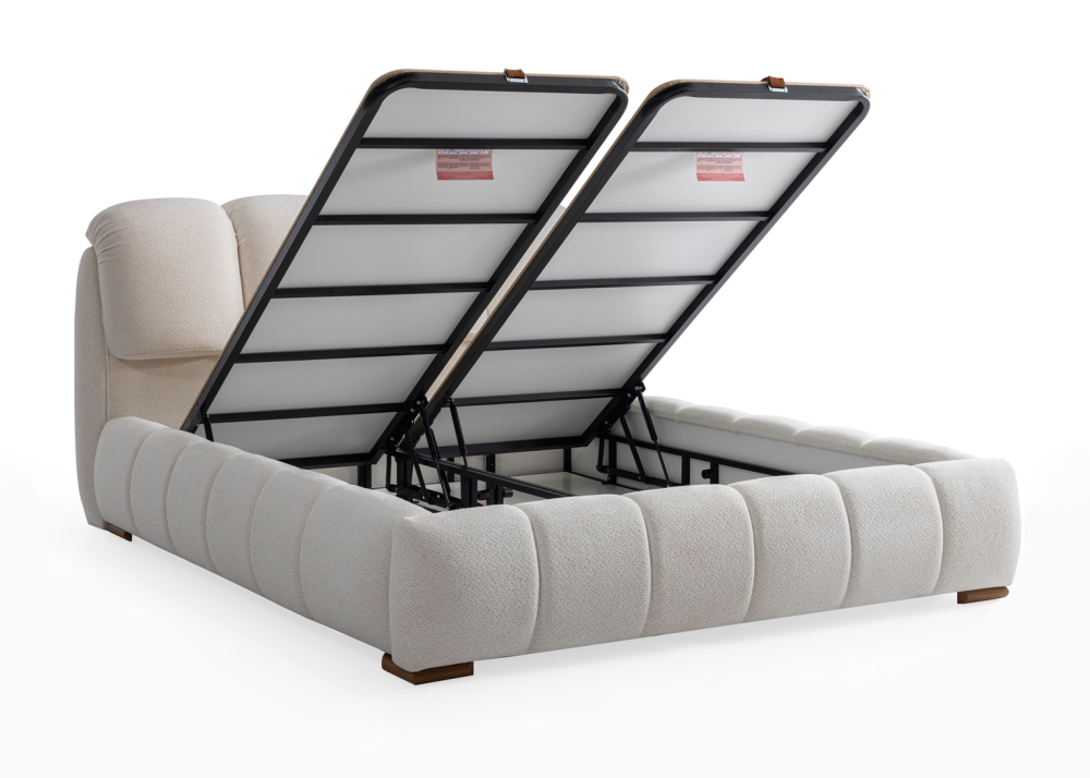 Тапицираната основа е с елегантен акцент от кожени дръжки, които улесняват отварянето на вградената подматрачна система, оборудвана с повдигащ механизъм и газови амортисьори. Те осигуряват лесен и безпроблемен достъп до просторната вътрешна зона за съхранение, идеална за завивки, възглавници, спално бельо и други вещи, които трябва да бъдат подредени практично и дискретно.