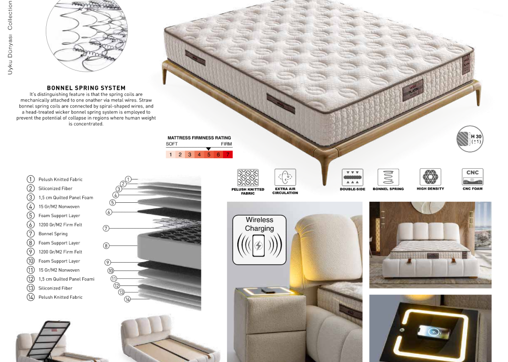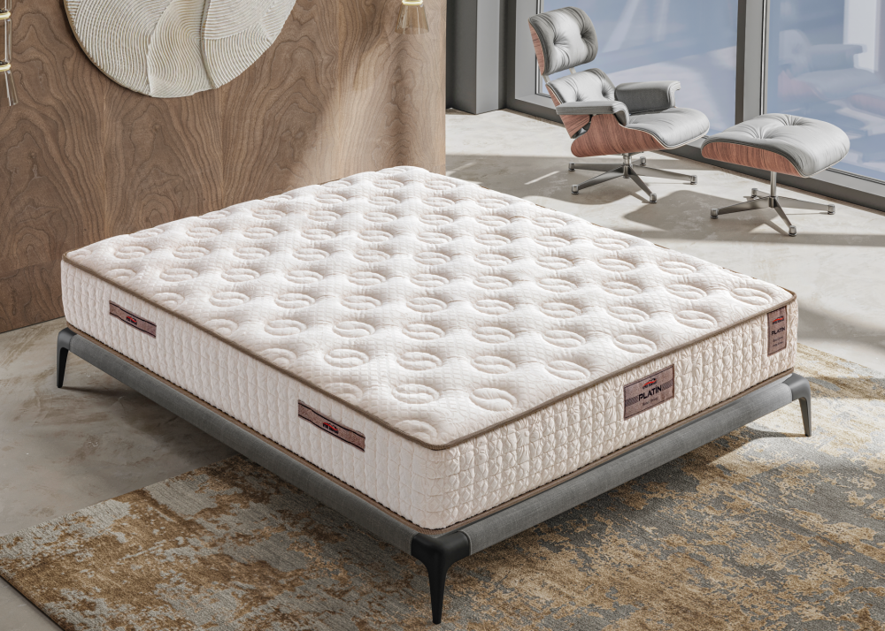 - Матракът Platin разполага с ядро от Bonnell Spring пружинна система, обвито с борд от дунапрен с висока плътност и допълнителни омекотяващи слоеве от дунапрен, мека пяна и HR пяна, които осигуряват стабилност, ортопедична опора и дълготраен комфорт по време на сън. Завършен е с луксозна дишаща дамаска Pelush Knitted Fabrik, която съчетава стил, проветривост и естетична визия, подходяща за всяка модерна спалня.