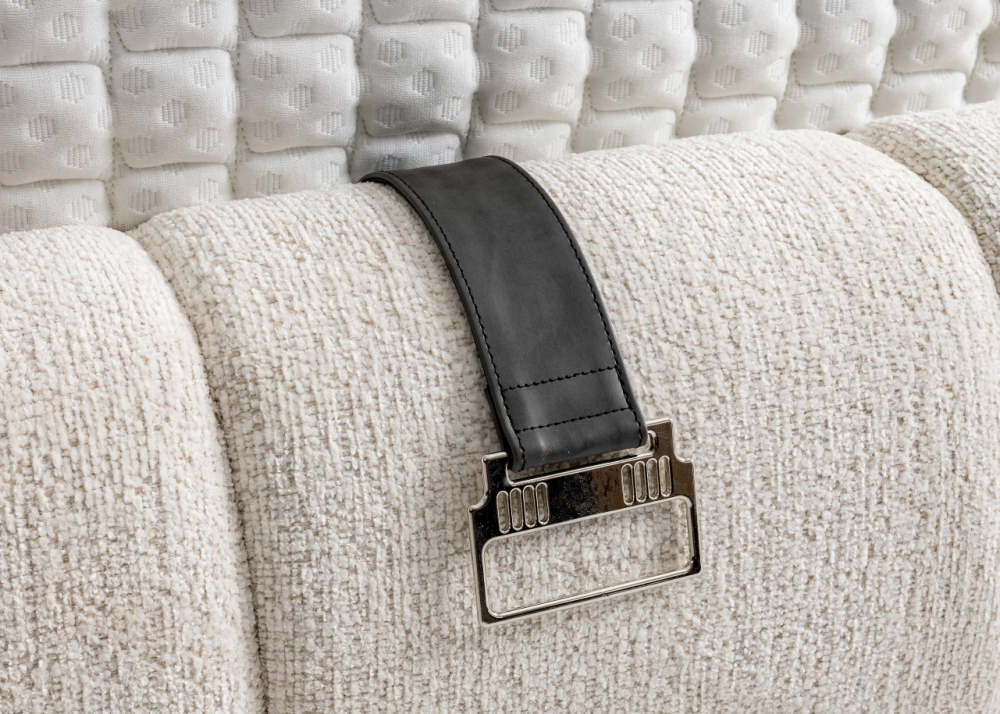Тапицирано легло Premium в цвят перлено бяло е с луксозна капитонирана табла и основа с кожени дръжки, оборудвана с вградена повдигаща се подматрачна система. Предлага се с опция за покупка без матрак или в комплект с матрак Premium.
