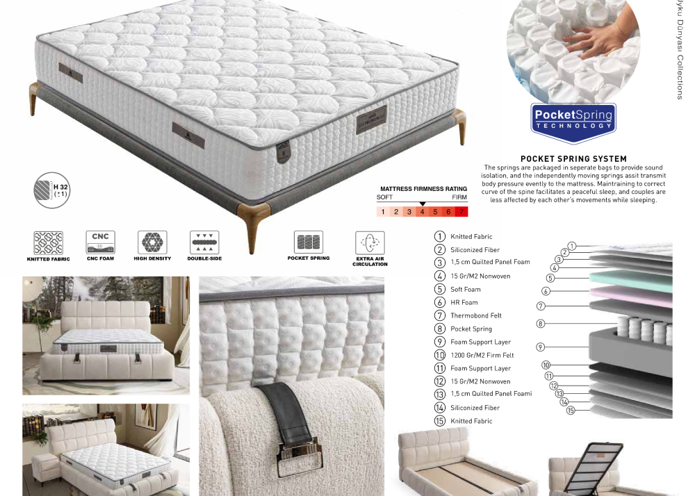• Матрак Premium е с ядро от Pocket Spring пружинна система обвита с борд от дунапрен с висока плътност и допълнителни омекотяващи слоеве от дунапрен, слой от мека пяна и HR пяна.