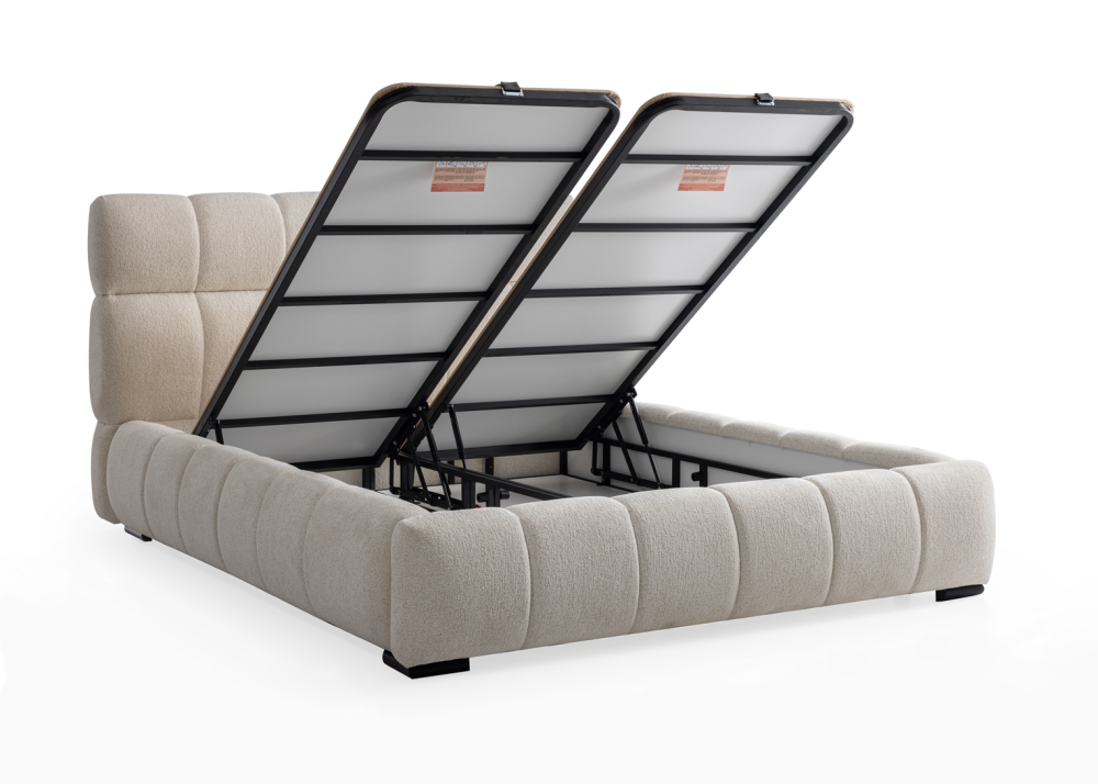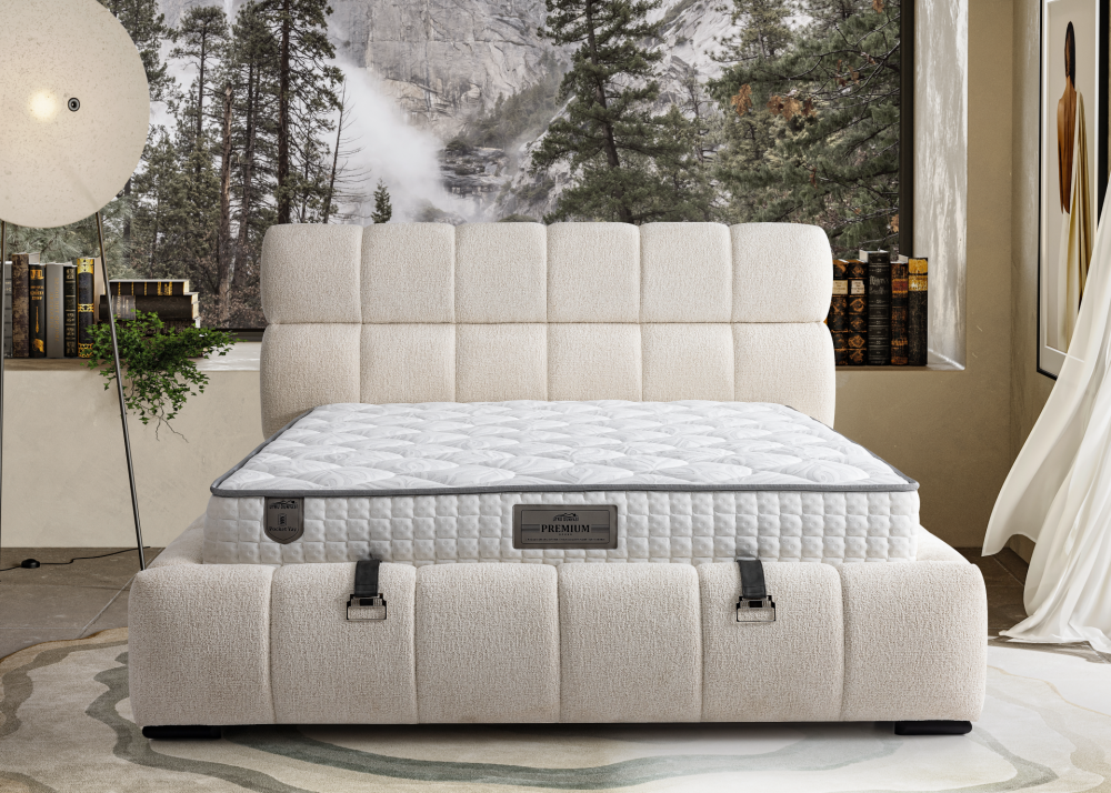 Тапицирано легло Premium е модулен и напълно окомплектован модел, който се състои от луксозна капитонирана табла и основа с кожени дръжки, улесняващи достъпа до вградена повдигаща се подматрачна система с газови амортисьори. Конструкцията осигурява удобно място за съхранение на завивки, спално бельо и други вещи, съчетавайки функционалност, стил и практичност.