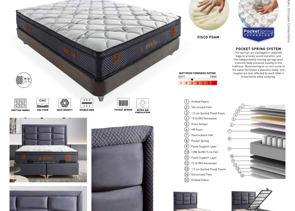 - Матракът Roma разполага с ядро от Pocket Spring пружинна система, обвито с борд от дунапрен с висока плътност и допълнителни омекотяващи слоеве от memory пяна, Visko пяна и HR пяна, които осигуряват стабилност, ортопедична опора и дълготраен комфорт по време на сън. Завършен е с луксозна дишаща дамаска Knitted Fabric, която съчетава стил, проветривост и естетична визия, подходяща за всяка модерна спалня.