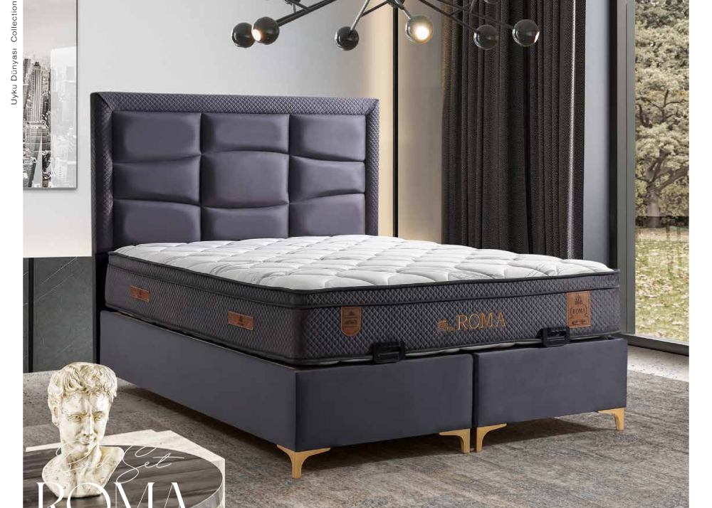 Тапицирано легло Roma Uyku Dünyasi се предлага в два цвята и десет размера, с възможност за покупка без матрак или в комплект с матрак Roma.