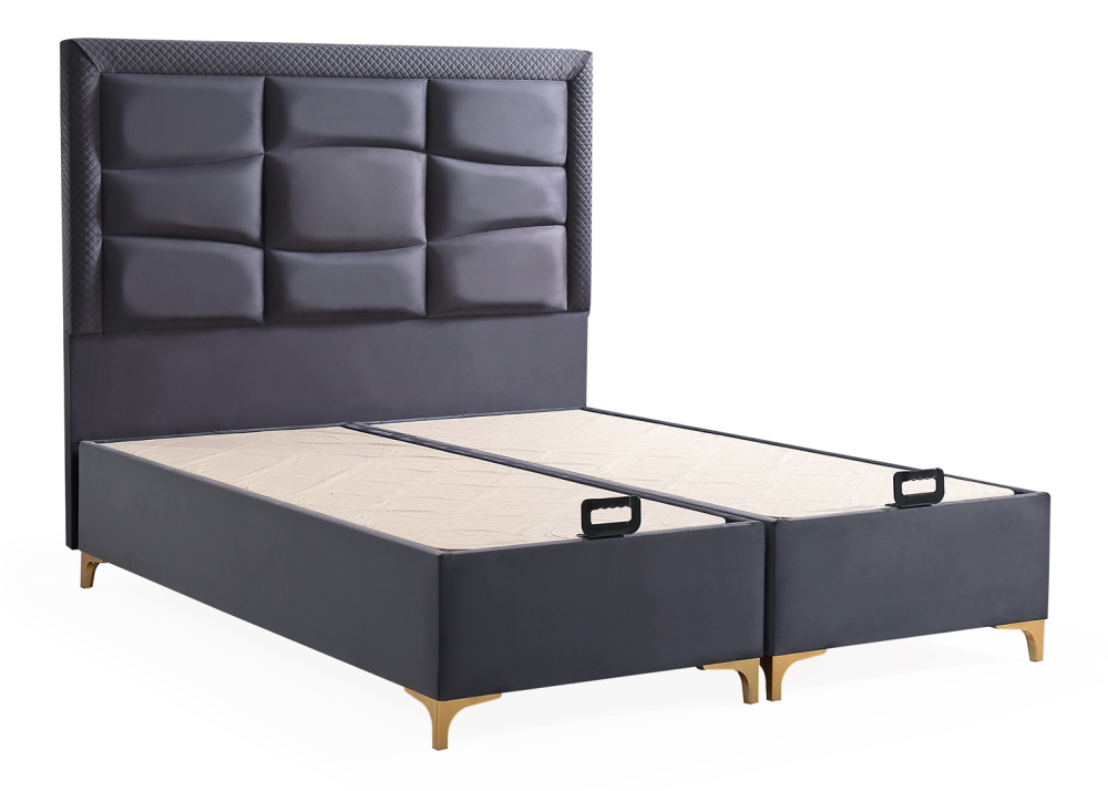 Тапицираното легло Roma от колекцията на Uyku Dünyasi в цвят Сив Диамант впечатлява с модерна капитонирана табла, която придава стилен акцент и усещане за допълнителен комфорт. Таблата и основата са тапицирани с висококачествена дамаска LEON NAVY BLUE, която внася уют и модерен стил във всяка съвременна спалня. Леглото разполага с тапицирана основа и вградена повдигаща се подматрачна система с газови амортисьори, която осигурява просторно и практично място за съхранение на завивки, спално бельо и други вещи.