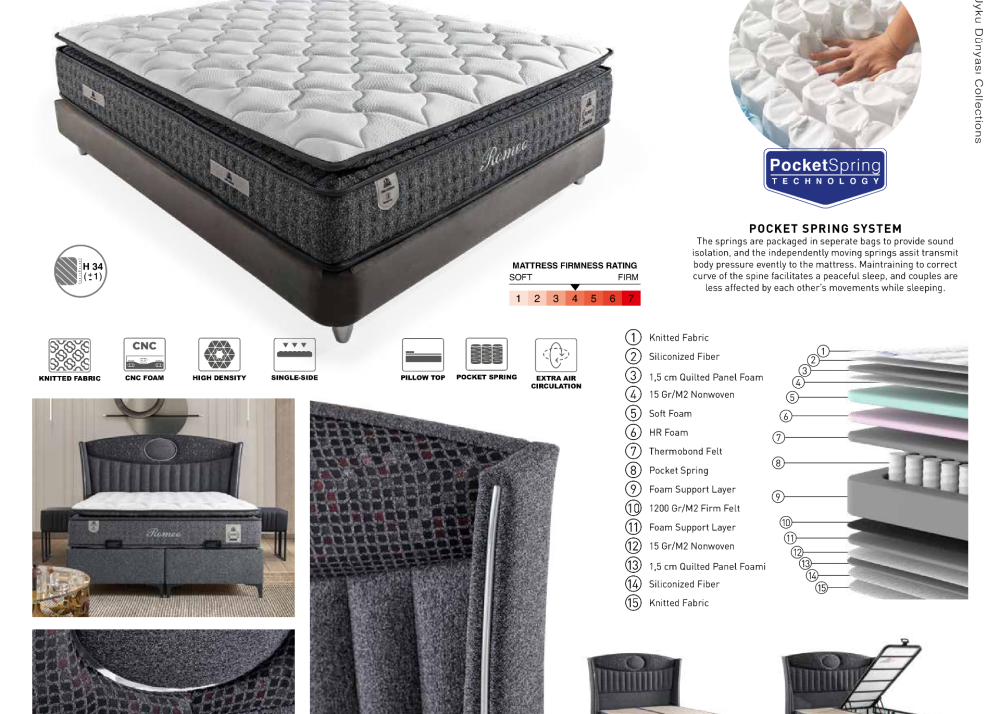 - Матрак Romeo е с ядро от Pocket Spring пружинна система обвита с борд от дунапрен с висока плътност и допълнителни омекотяващи слоеве от дунапрен, мека пяна и HR пяна.