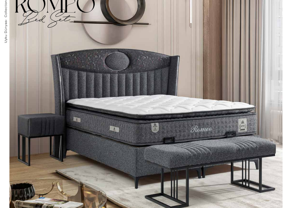 Тапицираното легло Romeo е част от колекцията на мебели Uyku Dünyasi съчетава модерен дизайн, безкомпромисно качество и практична функционалност и е идеален избор за елегантно и уютно обзавеждане.