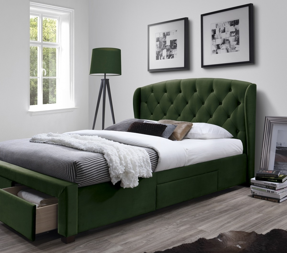 Тапицирано легло Sabrina в цвят тъмнозелено, снабдено е с красива капитонирана табла, основа и 4 плъзгащи чекмеджета. Легло Sabrina се предлага в комплект с подматрачна рамка, за матрак 160/200см. Спално легло Sabrina е капитонирано с качествена кадифена дамаска, в модерен дизайн. Чекмеджетата на тапицирано легло Sabrina са снабдени с плъзгащи механизми, за лесно и плавно отваряне / затваряне.