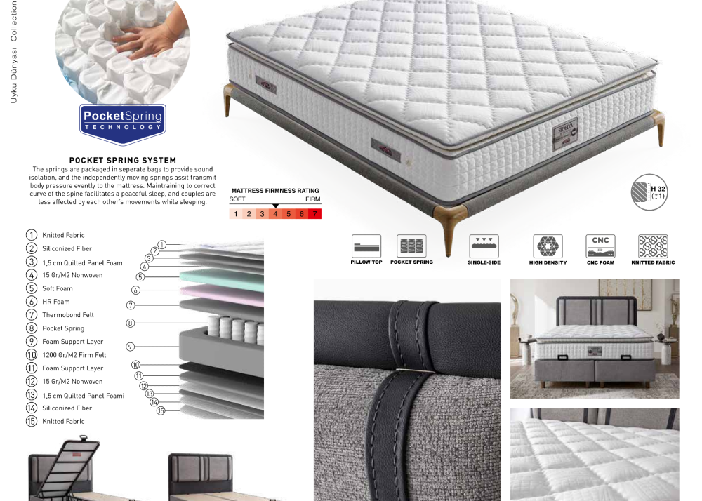 - Матракът Sidelya Deluxe е оборудван с прошит топ матрак от едната страна и ядро с Pocket Spring пружинна система, обвито с борд от дунапрен с висока плътност, който осигурява допълнителна устойчивост и стабилност. Вътрешната структура е допълнена с омекотяващи слоеве от дунапрен, мека пяна и HR пяна, гарантиращи дълготраен комфорт и ергономична опора по време на сън. Финалният щрих е дишащата дизайнерска дамаска Knitted Fabric, която съчетава елегантна визия и отлична проветривост.