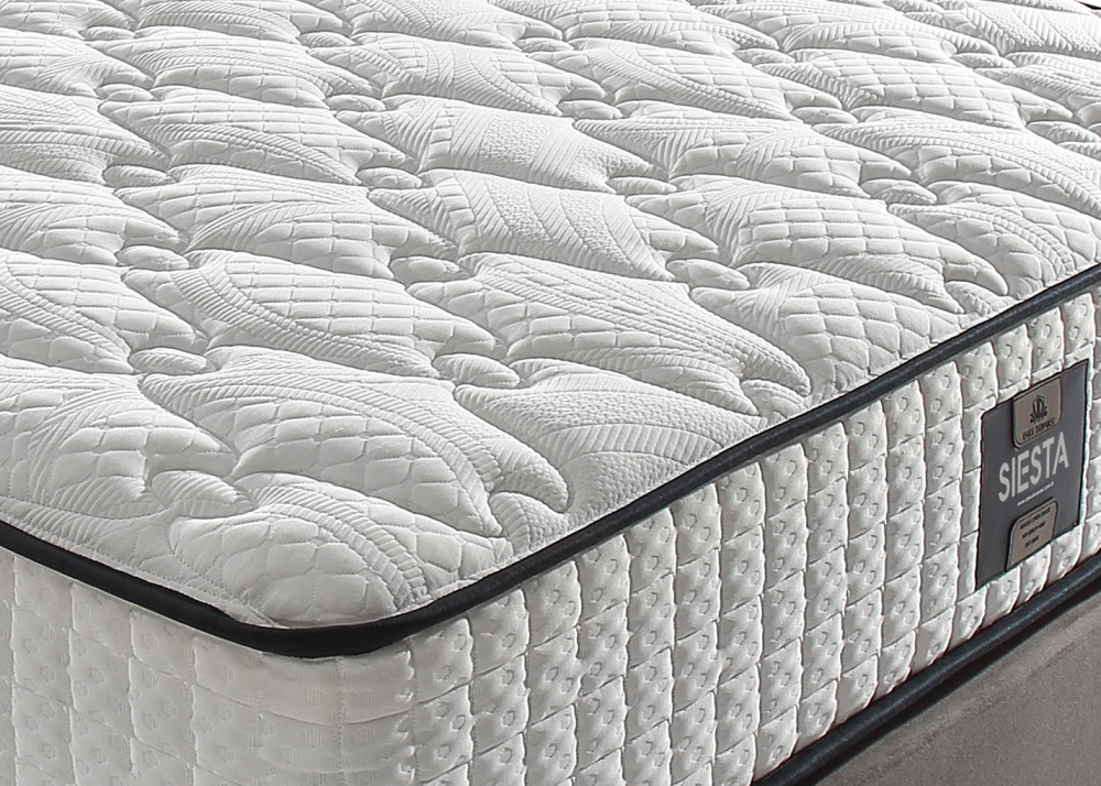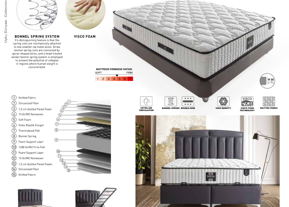 - Матрак Siesta е с ядро от Bonel Spring пружинна система обвита с борд от дунапрен с висока плътност и допълнителни омекотяващи слоеве от дунапрен, memory пяна и HR пяна.
