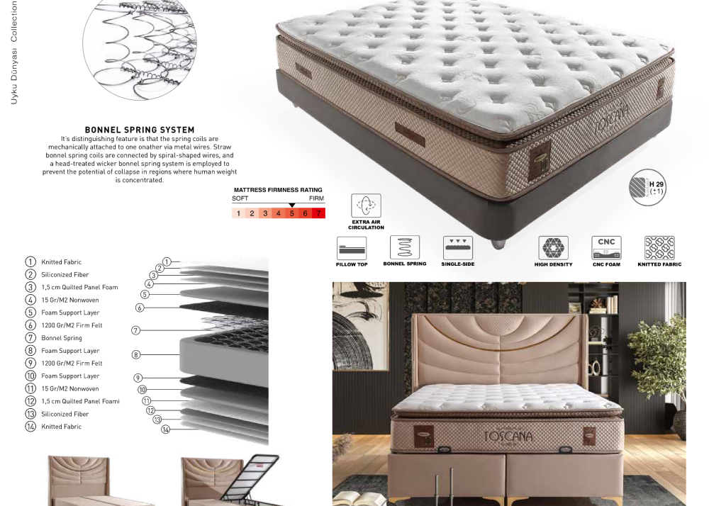 Матрак Toscana е изработен с вложена Bonnell Spring пружинна система, обвита с борд от дунапрен с висока плътност и допълнена с омекотяващи слоеве от дунапрен, HR пяна, твърд филц 1200 г/м², омекотителна вата и силиконизирани влакна. Тази многослойна структура осигурява балансирана ортопедична поддръжка на кръста, гърба, врата и коленете, като същевременно гарантира дълготраен комфорт по време на сън. Моделът е снабден с комфортен прошит топ матрак и завършен с дишаща дизайнерска дамаска Knitted Fabric, съчетаваща стил и проветривост.
