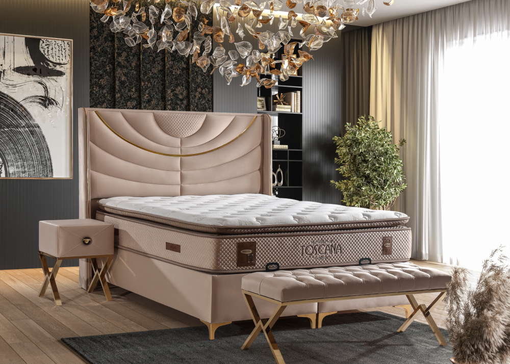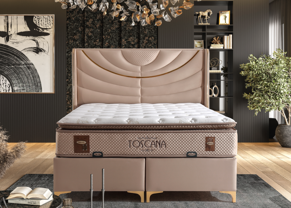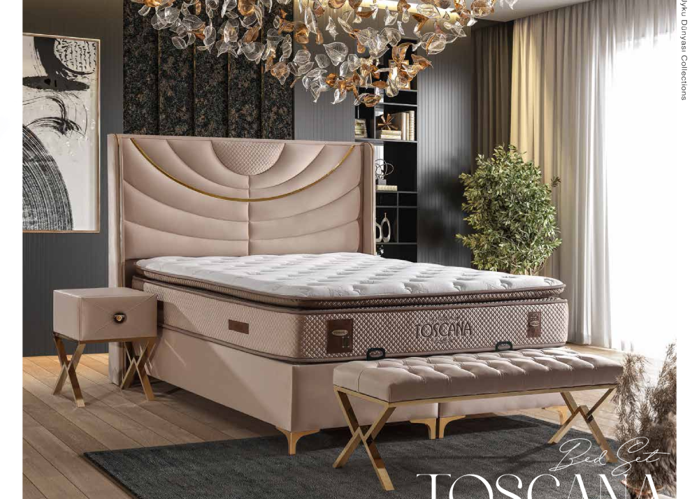 Тапицираното легло Toscana е част от колекцията на мебели Uyku Dünyasi съчетава модерен дизайн, безкомпромисно качество и практична функционалност и е идеален избор за елегантно и уютно обзавеждане.