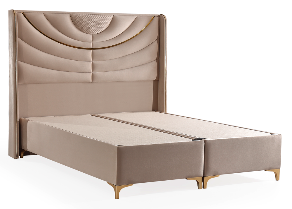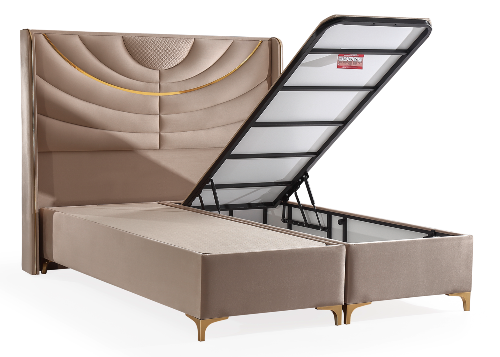 Модерната капитонирана табла е декорирана с алуминиева лайсна, която придава допълнителен комфорт и естетика, превръщайки леглото в акцент с изтънчен характер за всяка елегантна и модерна спалня. Таблата и основата са тапицирани с висококачествена и устойчива мека дамаска STRONG Stocco, която създава усещане за уют, комфорт и стил. Тапицираната основа е снабдена с вградена подматрачна система, оборудвана с повдигащ механизъм и газови амортисьори, които осигуряват лесен достъп до просторно вътрешно пространство за съхранение – идеално за завивки, възглавници, спално бельо и други вещи, които изискват практично и дискретно подреждане. Конструкцията на леглото гарантира здравина, удобство и дълготрайна експлоатация, съчетавайки функционалност, стил и надеждност в един завършен продукт, който се вписва идеално във всяко съвременно интериорно пространство.