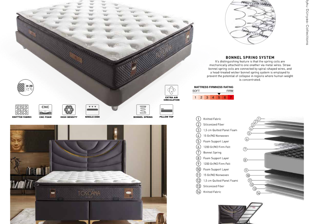 Матрак Toscana е изработен с вложена Bonnell Spring пружинна система, обвита с борд от дунапрен с висока плътност и допълнена с омекотяващи слоеве от дунапрен, HR пяна, твърд филц 1200 г/м², омекотителна вата и силиконизирани влакна. Тази многослойна структура осигурява балансирана ортопедична поддръжка на кръста, гърба, врата и коленете, като същевременно гарантира дълготраен комфорт по време на сън. Моделът е снабден с комфортен прошит топ матрак и завършен с дишаща дизайнерска дамаска Knitted Fabric, съчетаваща стил и проветривост.