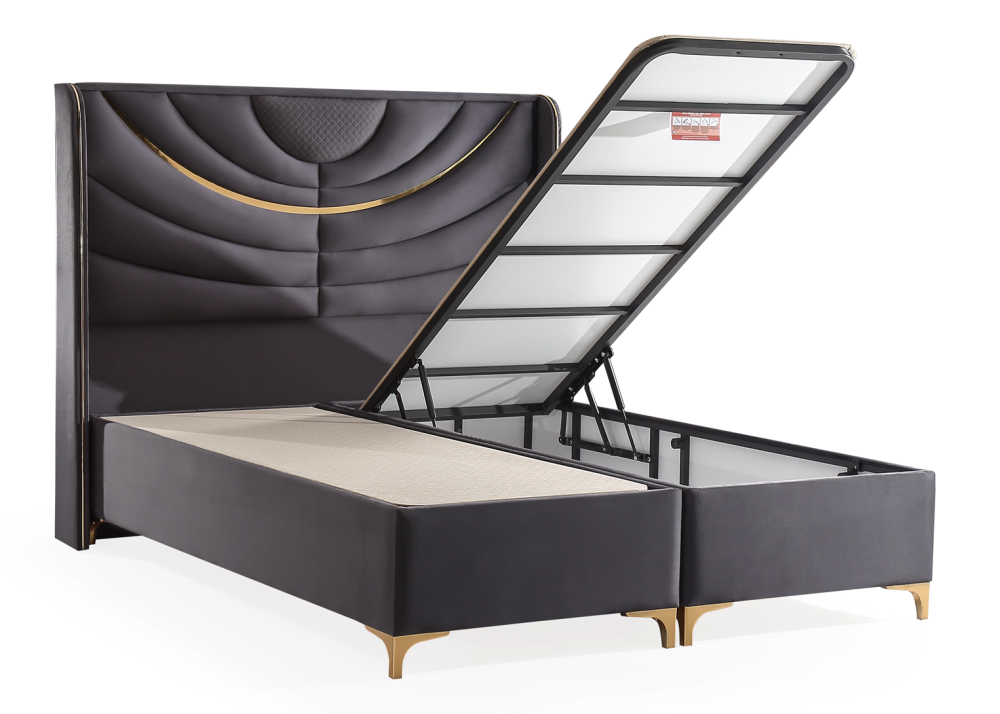Модерната капитонирана табла е декорирана с алуминиева лайсна, която придава допълнителен комфорт и естетика, превръщайки леглото в акцент с изтънчен характер за всяка елегантна и модерна спалня. Таблата и основата са тапицирани с висококачествена и устойчива мека дамаска LEON NAVY BLUE, която създава усещане за уют, комфорт и стил. Тапицираната основа е снабдена с вградена подматрачна система, оборудвана с повдигащ механизъм и газови амортисьори, които осигуряват лесен достъп до просторно вътрешно пространство за съхранение – идеално за завивки, възглавници, спално бельо и други вещи, които изискват практично и дискретно подреждане. Конструкцията на леглото гарантира здравина, удобство и дълготрайна експлоатация, съчетавайки функционалност, стил и надеждност в един завършен продукт, който се вписва идеално във всяко съвременно интериорно пространство.