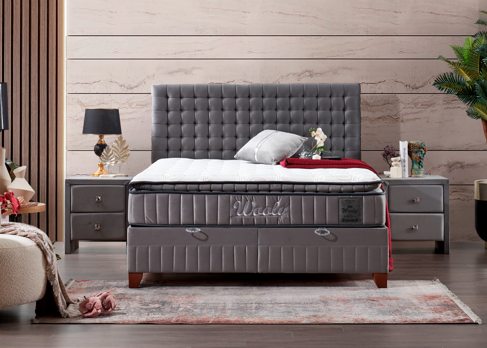 Тапицирано легло Wooly в цвят Платинено Сиво, комплект с матрак Wooly, който е снабден с комфортен прошит топ матрак и дизайнерска плюшена дамаска от 100% естествена чиста вълна. Тапицирано легло Wooly е с модерна капитонирана табла и капитонирана основа, с вградена повдигаща се подматрачна рамка. В матрак Wooly са вложени Bonnell пружинна система, омекотяващи слоеве от дунапрен с висока плътност и DNS пяна. Може да се закупи и без матрака.