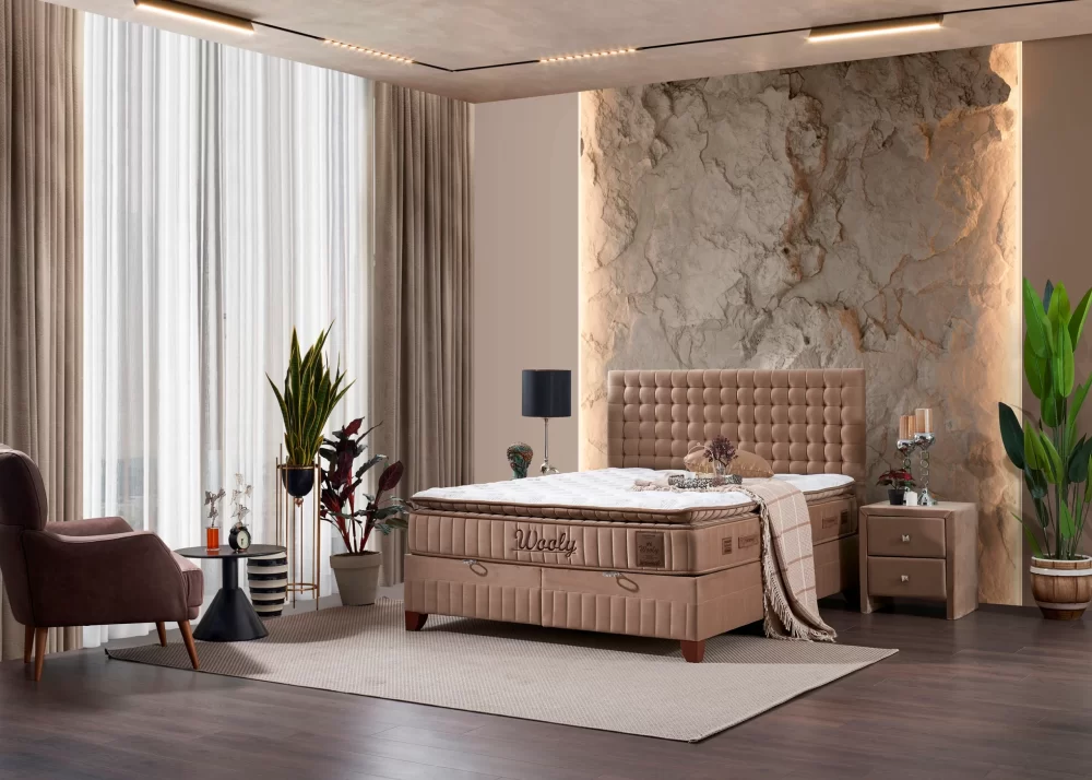Тапицирано легло Wooly в цвят Кафява Охра, комплект с матрак Wooly, който е снабден с комфортен прошит топ матрак и дизайнерска плюшена дамаска от 100% естествена чиста вълна. Тапицирано легло Wooly е с модерна капитонирана табла и капитонирана основа, с вградена повдигаща се подматрачна рамка. В матрак Wooly са вложени Bonnell пружинна система, омекотяващи слоеве от дунапрен с висока плътност и DNS пяна. Може да се закупи и без матрака.