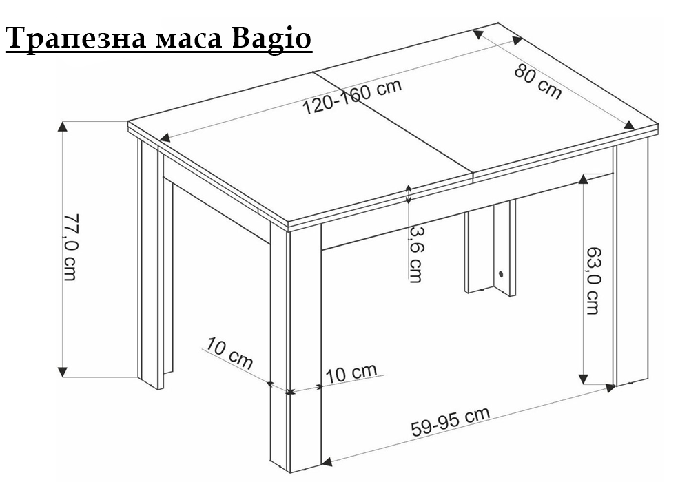 - Маса Bagio е с дължина на плота 120см и може да се разтегне до 160см.