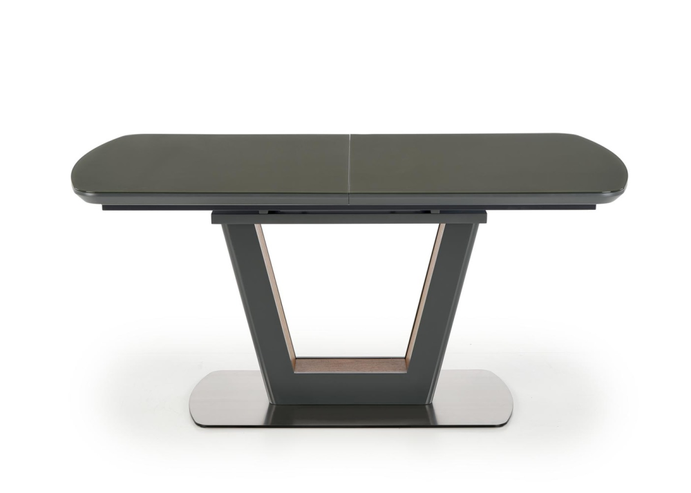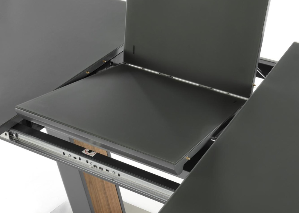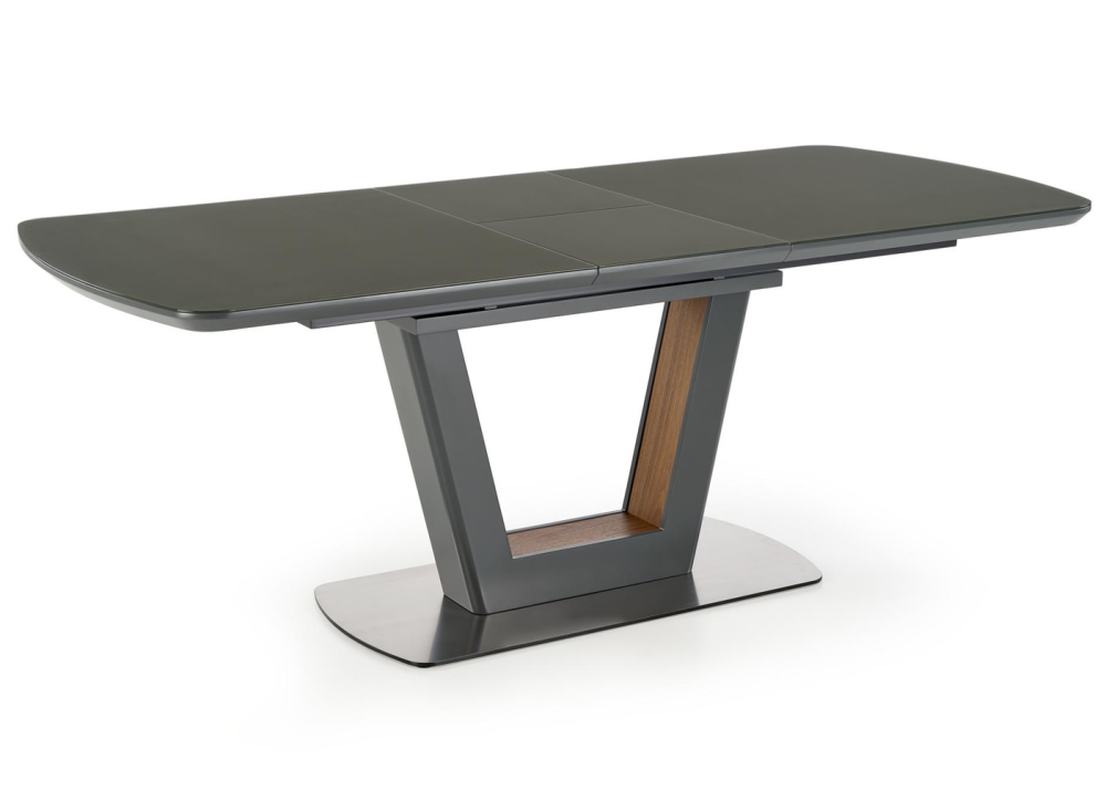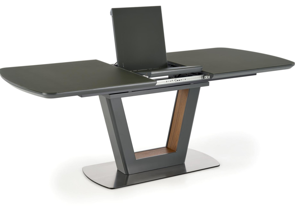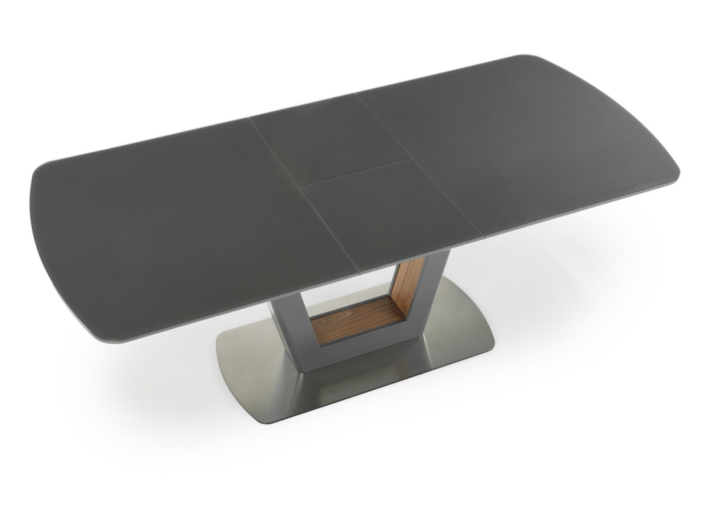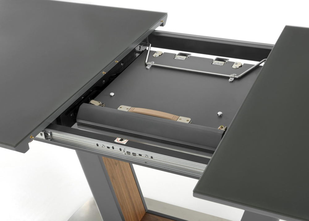Разтегателна маса Bilotti е с функционален разтегателен плот, който се изработва от ламиниран и лакиран MDF в цвят антрацит мат, като е добавено и закалено темперирано стъкло. Маса Bilotti е с дължина на плота 160см и може да се разтегне до 200см, с разширителен плот включен в комплекта. Разтегателния плот е снабден с качествен синхронен механизъм за плавно разтягане на плота. Конструкцията / основа е в отличаващ се модерен дизайн, изработва се от неръждаема прахово боядисана стомана в цвят антрацит мат, с декоративни акценти в цвят орех от вътрешната страна.