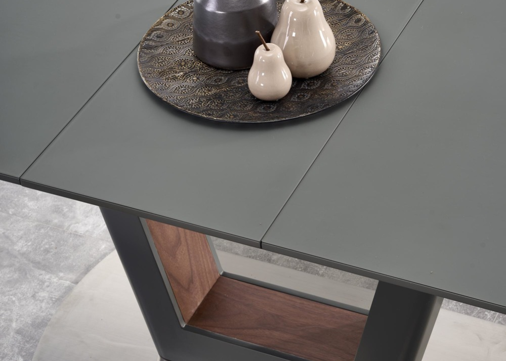 Трапезна маса Bilotti е луксозна от висок клас, с разтегаем плот в изчистен елегантен дизайн в цвят антрацит мат, темперирано стъкло и модерна основа декорирана от вътрешната страна в цвят орех. Разтегателна маса Bilotti се изработва от висококачествени материали ламиниран и лакиран MDF / темперирано стъкло / неръждаема прахово боядисана стомана. Притежава функционален разтегаем плот от ламиниран и лакиран MDF в цвят антрацит мат, като е добавено и закалено темперирано стъкло. Стабилна конструкция и основа / крака в уникален дизайн, от неръждаема прахово боядисана стомана в цвят антрацит мат с декоративни акценти в цвят орех от вътрешната страна. Универсалността на разтегателната маса Ви позволява лесно да се превърне в по-голяма маса и да имате възможността да организирате различни събирания, което я прави практично и стилно допълнение към Вашия дом.