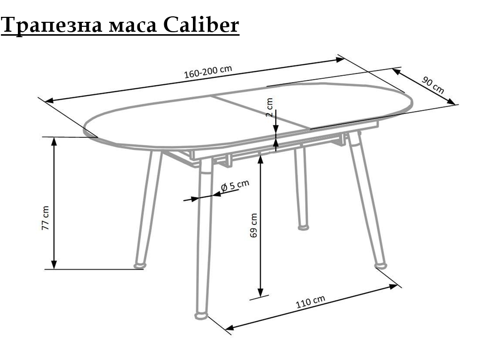 Маса Caliber е с функционален разтегателен плот и здрави и устойчиви крака, изработва се от качествени материали в комбинация от лакиран MDF, ламинат MDF и боядисана стомана. Маса Caliber е с дължина на плота 160см и може да се разтегне до 200см., с разширителен плот включен в комплекта. Разтегателния плот е снабден с качествен механизъм за плавно разтягане на плота.