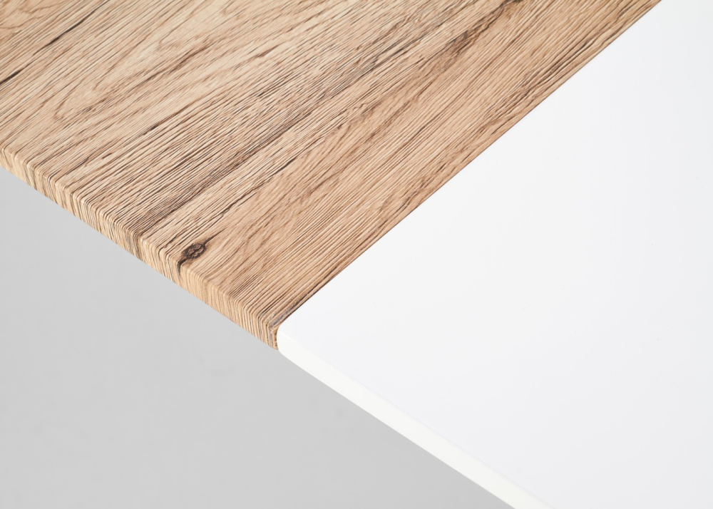 Трапезна маса Caliber е с модерен разтегателен плот в бял цвят и елегантни крака в дървесен декор. Маса Caliber се изработва от лакиран MDF, ламинат MDF и боядисана стомана, в впечетляващ елегантен дизайн. Разтегателна маса Caliber ще придаде привлекателна нотка, модерен и изискан привкус на Вашия дом, но и гарантира издръжливост и стабилност.