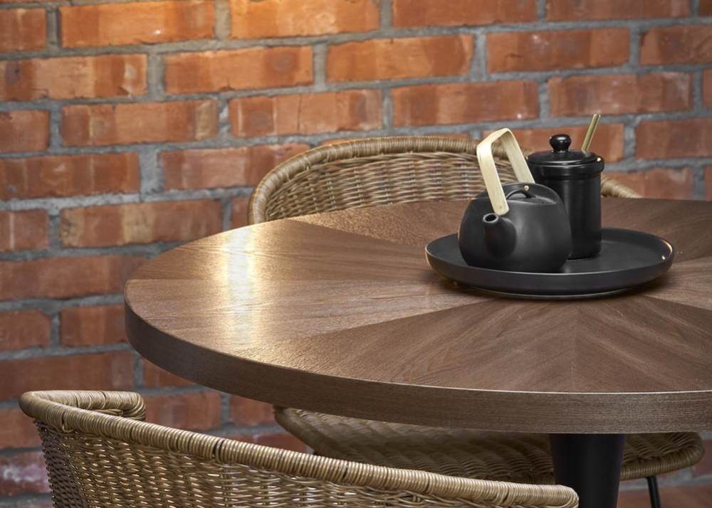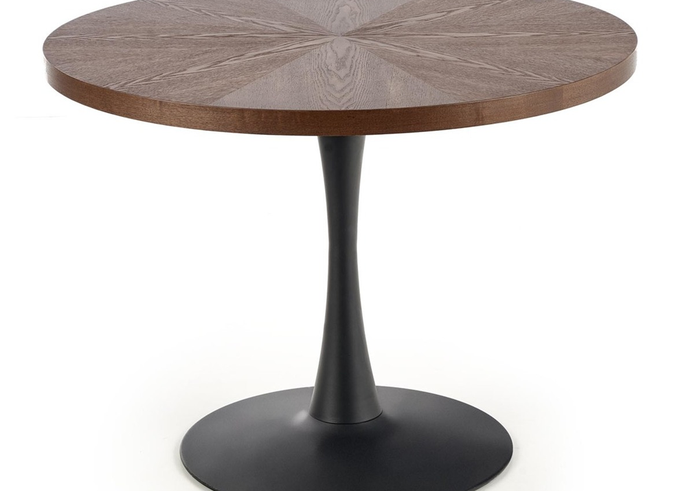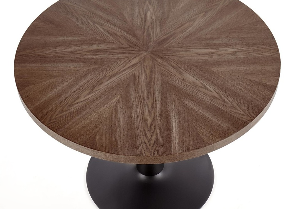 Трапезна маса Carmelo е с красив кръгъл плот, от MDF + естествен фурнир, в елегантен дървесен декор цвят Орех. Снабдена е със стабилна стоманена прахово боядисана конструкция, основа в черно. Маса Carmelo е перфектното решени за по-малки помещения, подходящ е за съчетанието с всеки един интериор.