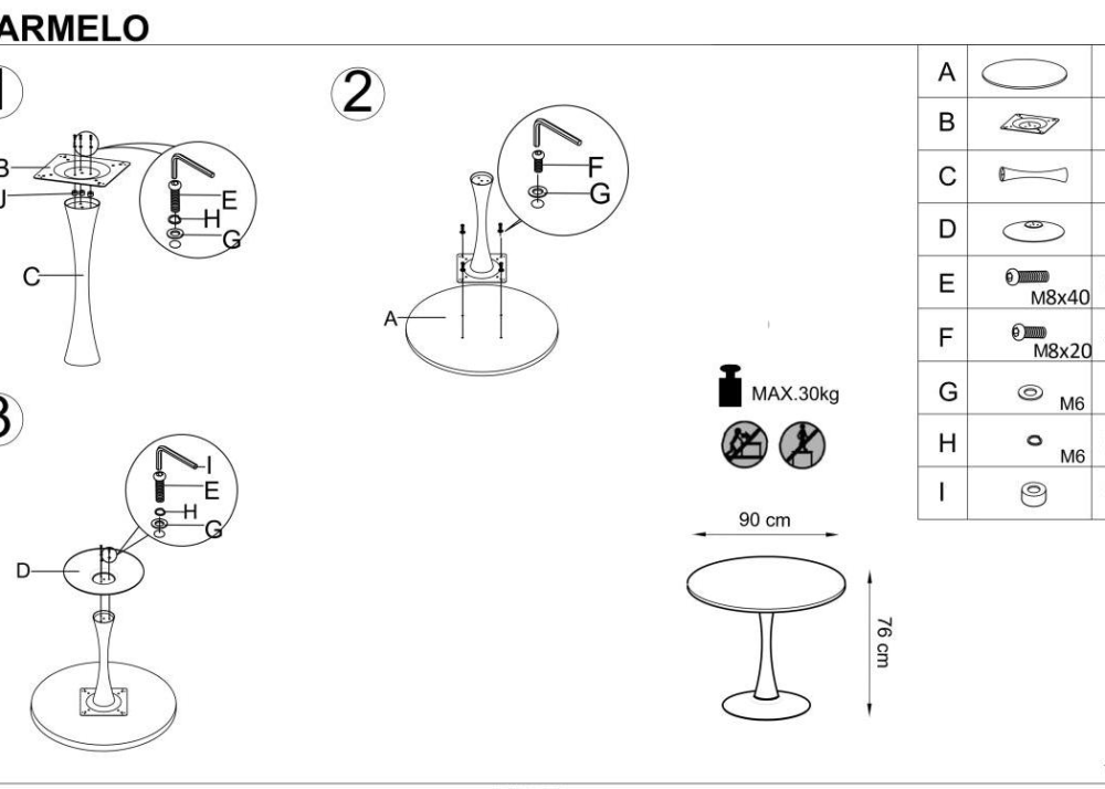 Кръглия плот на трапезна маса Carmelo се изработва от ламиниран MDF + естествен фурнир, в дървесен декор цвт орех. Конструкцията / основата, се изработва от прахово боядисана стомана, в черен цвят.