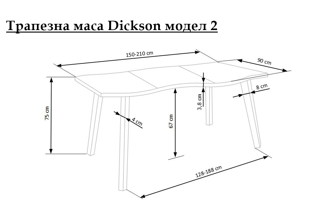 - Маса Dickson 2 е с дължина на плота 150см и може да се разтегне до 210см.
