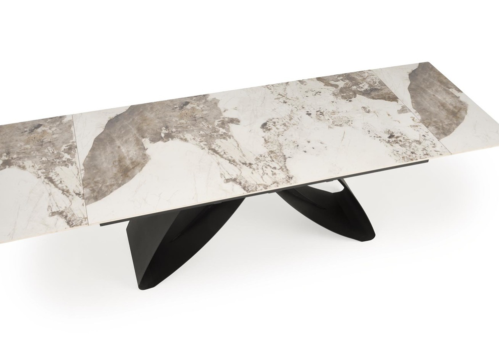 Разтегателна маса Hilario Бял мраморе с функционален разтегателен плот, който се изработва от устойчив синтерован камък в цвят черен мрамор с бели ефекти. Маса Hilario Бял мрамор е с дължина на плота 180см и може да се разтегне до 260см, с помощта на два разширителни странични плота от синтерован камък, снабдени с механизми, включен в комплекта. Конструкцията и краката са в уникален модерен дизайн, изработват се от прахово боядисана стомана в черен цвят.