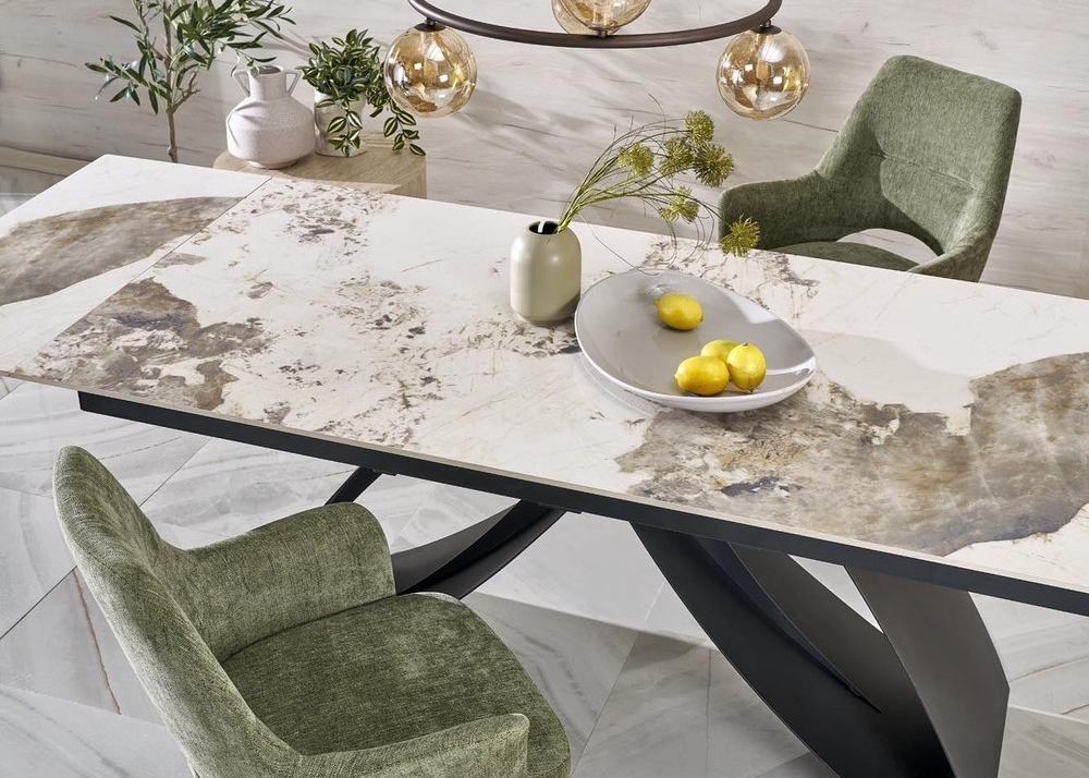 - Маса Hilario Бял мрамор, с разтегателен плот от синтерован камък, в правоъгълна форма.