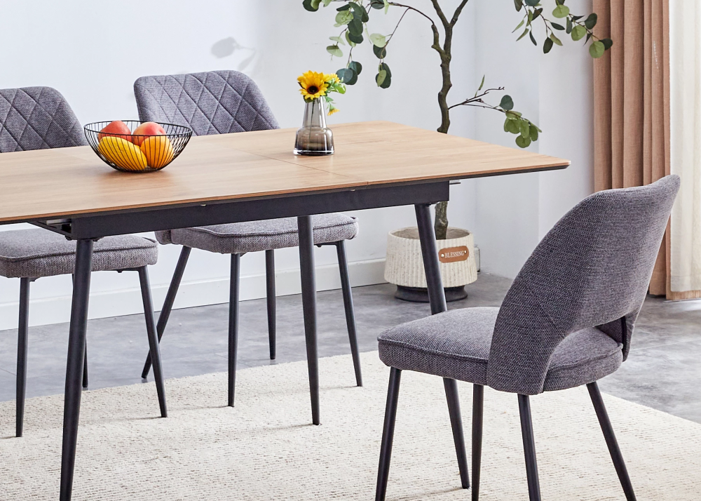 - Трапезна маса с разтегателен плот, в правоъгълна форма и метална основа.