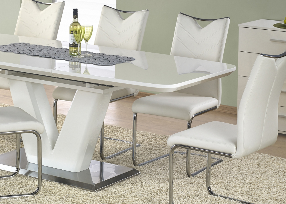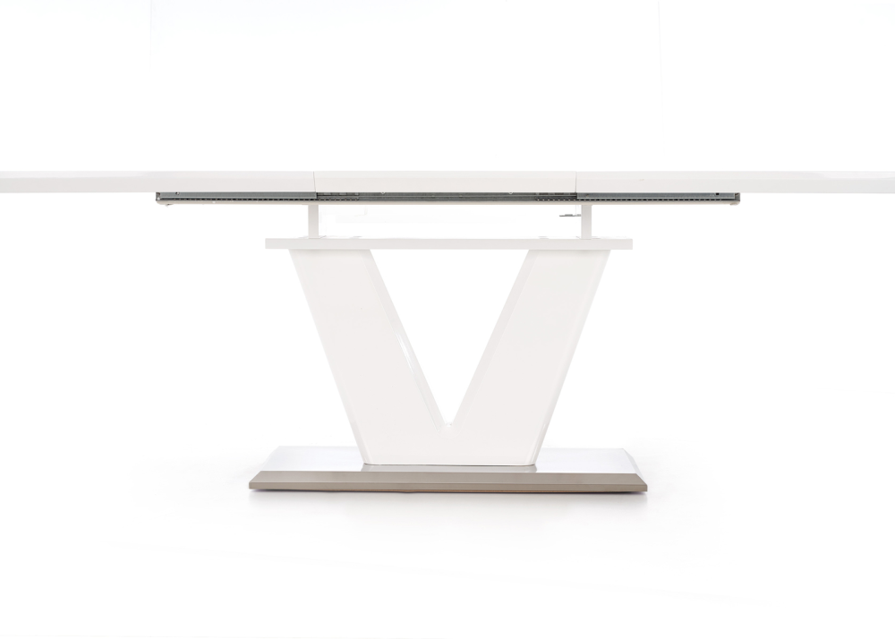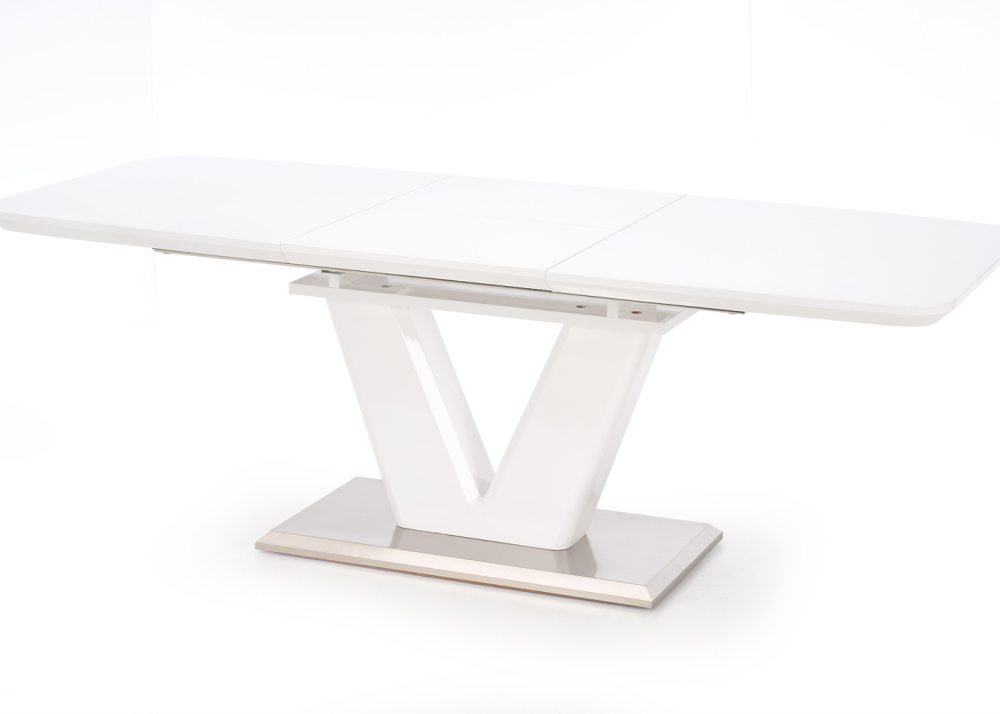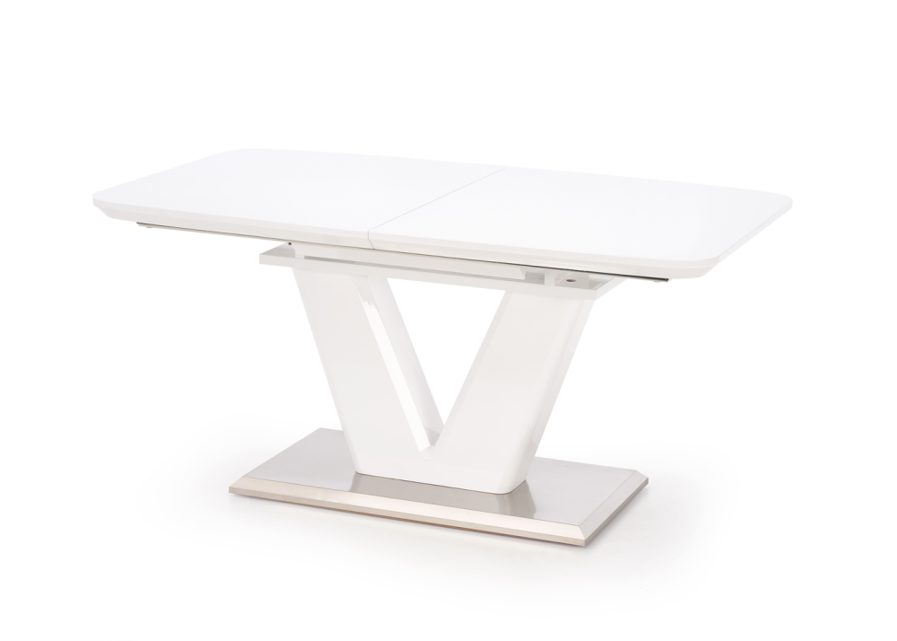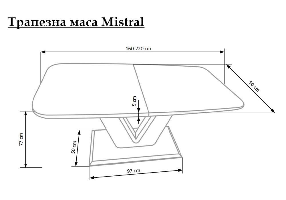Разтегателна маса Mistral е с функционален разтегателен плот, който се изработва от лакиран MDF, в бял цвят с лъскав ефект. Маса Mistral е с дължина на плота 160см и може да се разтегне до 220см, с разширителен плот включен в комплекта. Разтегателния плот е снабден с качествен синхронен механизъм за плавно разтягане на плота. Конструкцията / масивен крак в отличаващ се модерен дизайн, изработва се от неръждаема хромирана стомана, в бял цвят с хромирани детайли.