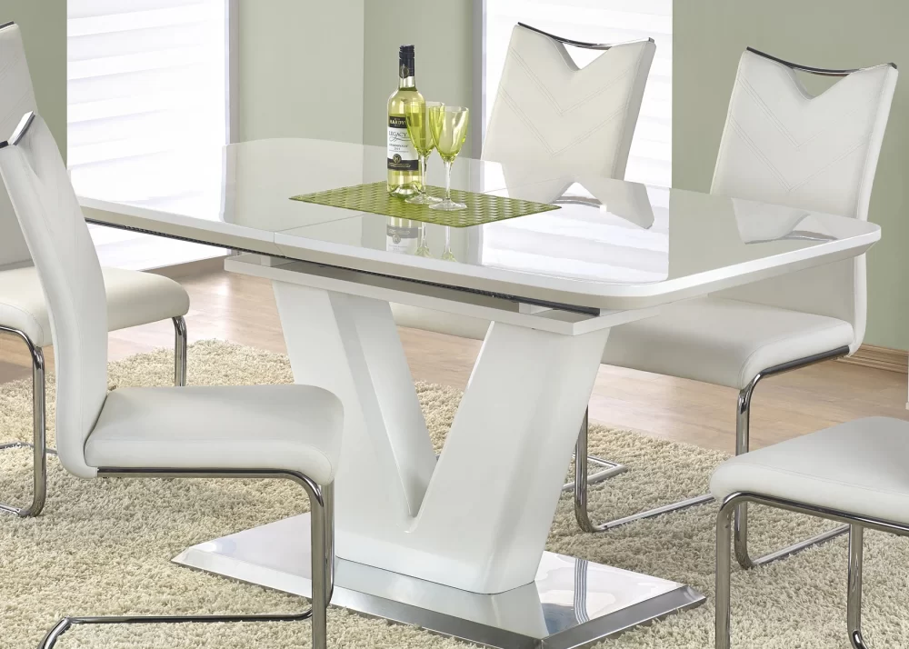 Трапезна маса Mistral е луксозна от висок клас, в елегантен дизайн бял с бляскав ефект и модерна основа в бяло с хромирани елементи. Разтегателна маса Mistral се изработва от висококачествени материали лакиран MDF и неръждаема хромирана стомана. Притежава функционален разтегаем плот от лакиран MDF, в бял цвят и стабилна конструкция / масивен крак в уникален дизайн, от неръждаема хромирана стомана в бял цвят с хромирани елементи. Универсалността на разтегателната маса Ви позволява лесно да се превърне в по-голяма маса и да имате възможността да организирате различни събирания, което я прави практично и стилно допълнение към Вашия дом.