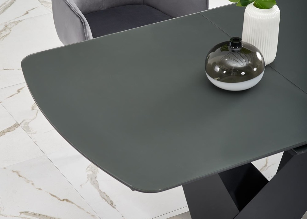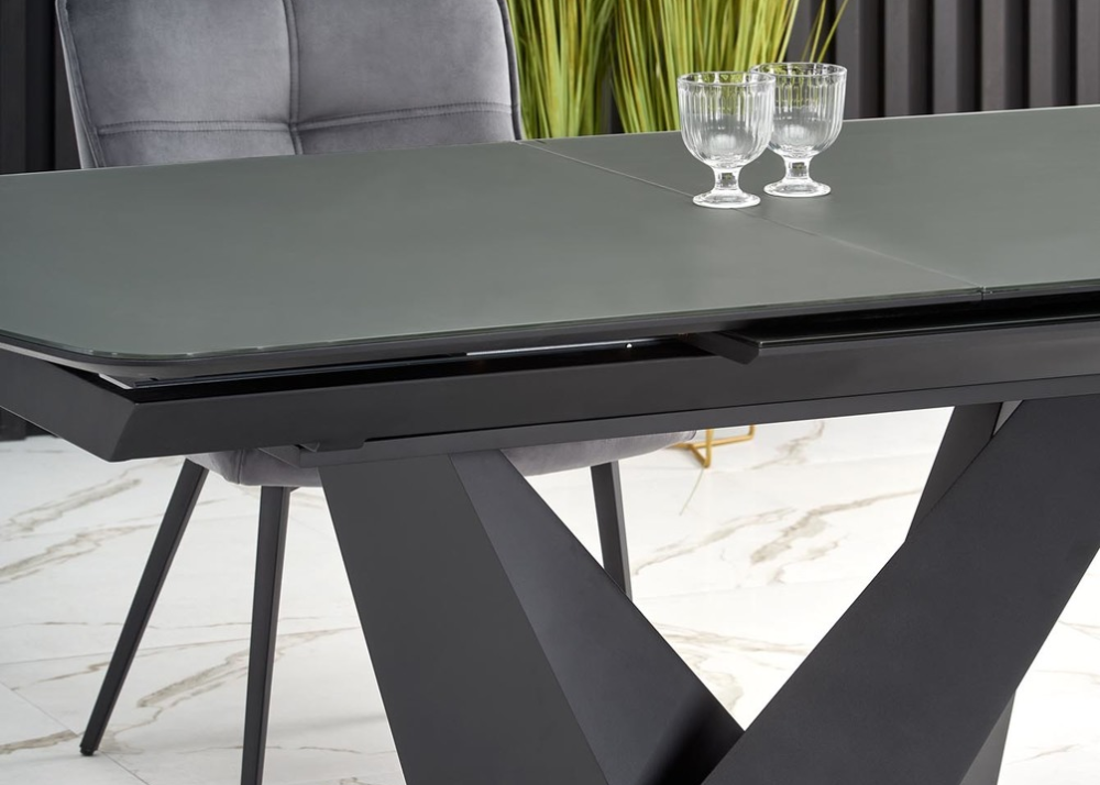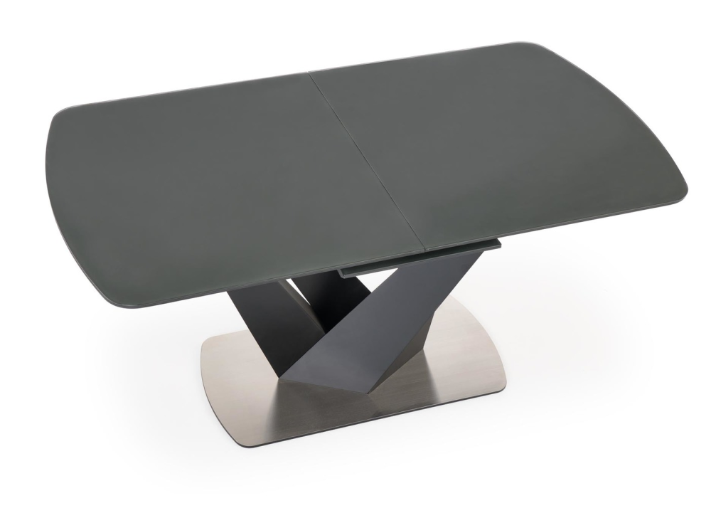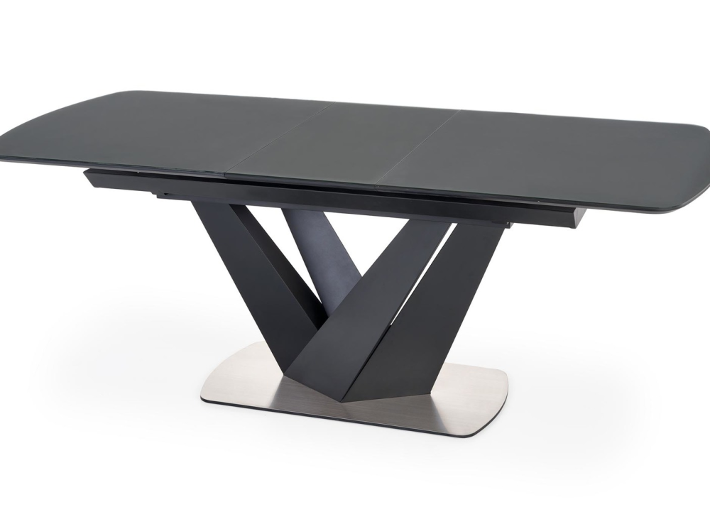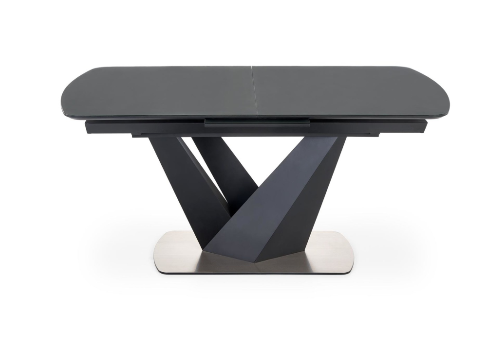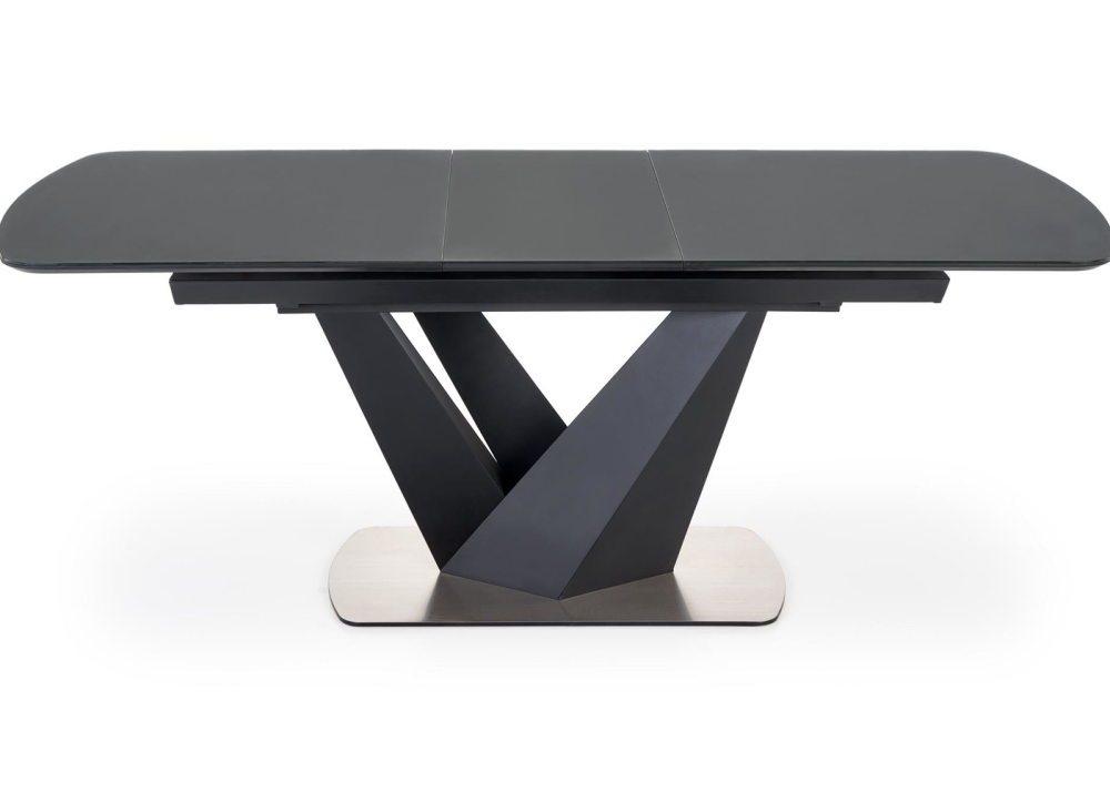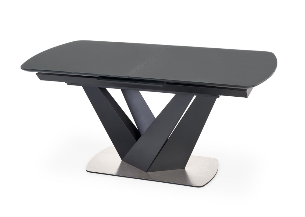Разтегателна маса Patrizio е с функционален разтегателен плот, който се изработва от лакиран MDF мат в тъмно сив цвят, като е добавено и закалено темперирано стъкло. Маса Patrizio е с дължина на плота 160см и може да се разтегне до 200см, с разширителен плот включен в комплекта. Разтегателния плот е снабден с качествен синхронен механизъм за плавно разтягане на плота. Конструкцията / краката са в уникален модерен дизайн, изработва се от неръждаема прахово боядисана стомана в черен цвят.