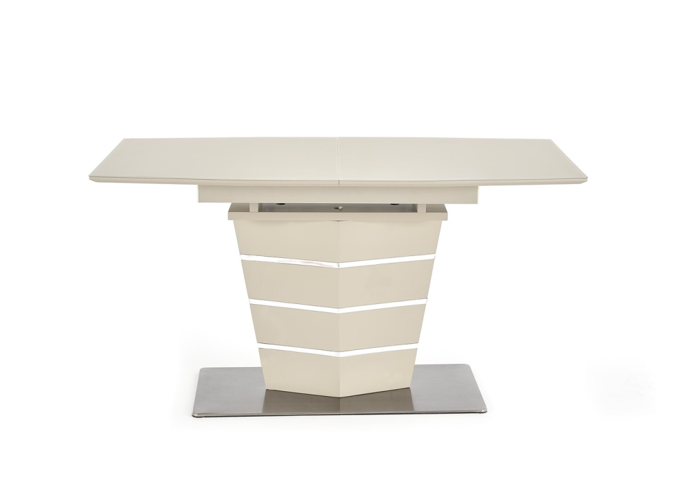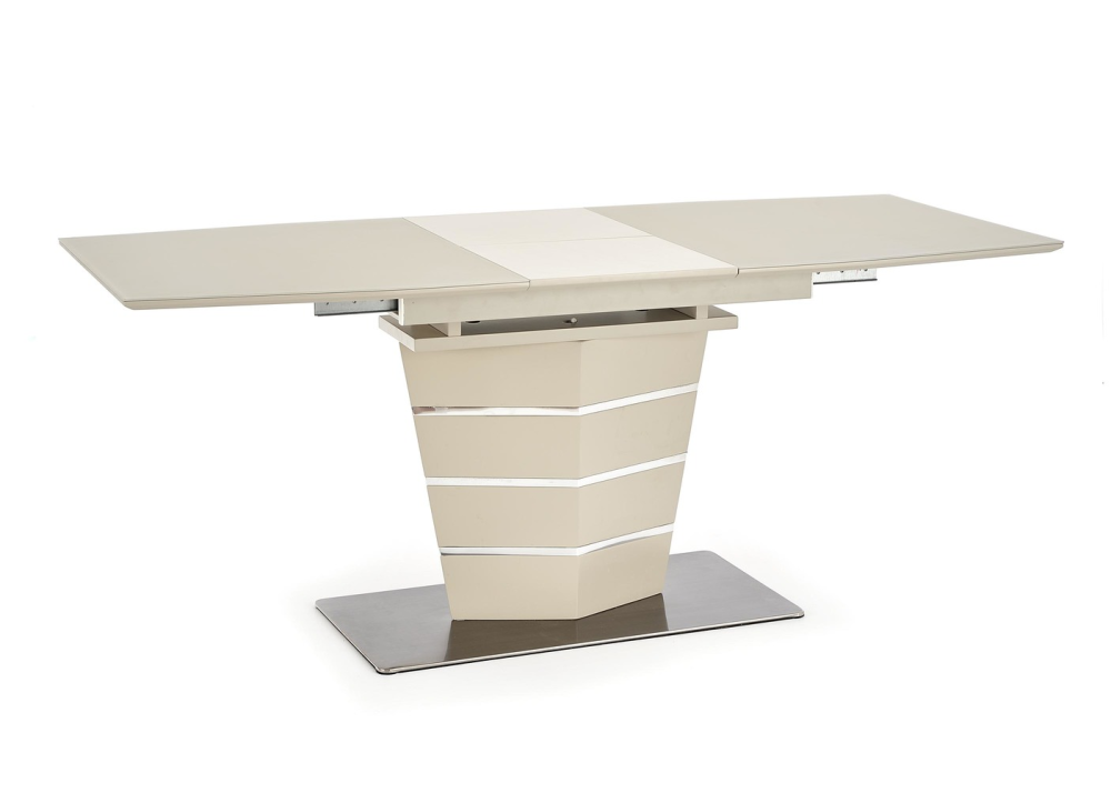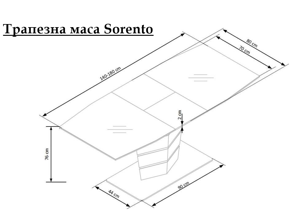 Маса Sorento е с функционален разтегателен плот, който се изработва от лакиран MDF и темперирано стъкло. Маса Sorento е с дължина на плота 140см и може да се разтегне до 180см., с разширителен плот включен в комплекта. Разтегателния плот е снабден с качествен механизъм за плавно разтягане на плота. Основата / крак се изработва от неръждаема стомана с хромирани детайли.